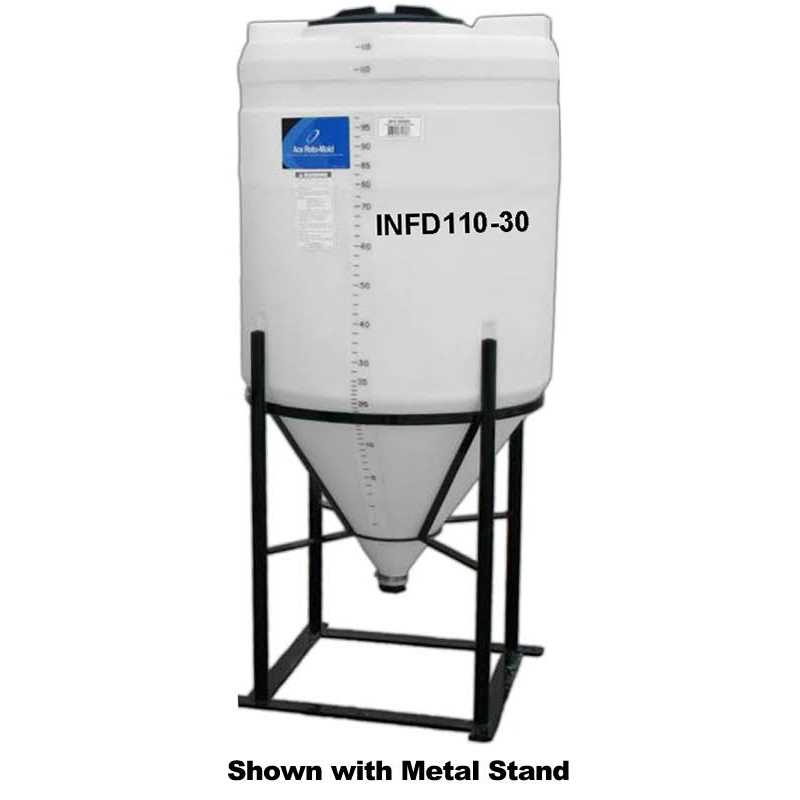 The Ace Roto-Mold 30 inch long 110 gallon 55 degree plastic cone bottom inductor tank is designed for storing and transporting liquids. The cone-shaped bottom allows for easy and complete drainage of the tank, while the high-quality plastic construction ensures it is resistant to corrosion and impact damage. With a fully draining outlet, this tank is perfect for industrial and agricultural applications.
