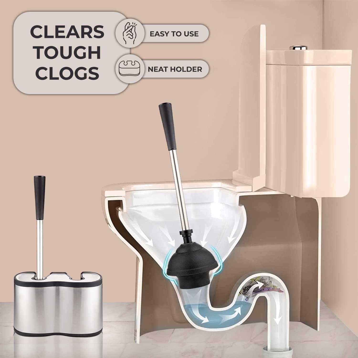 It features a larger plunger cup. It offers an impressive suction that can unclog your toilet bowls with just a few pumps. It comes with a pull-out flange that ensures the most secure fit in all bowls. HYGIENIC SCRUBBER BRUSH – The Toilet Brush is designed with a long shaft that allows easy cleaning of the area under the rim of toilet bowls – keeping your hands away from touching the bowl directly. The brush head lasts longer with its durable bristles and is 100% replaceable! FREESTANDING DOUBLE HOLDER – With its dual hideaway canister, you can get rid of an unsightly toilet plunger and brush in your bathroom. The Bathroom Cleaning Accessories stay firmly inside the holder while collecting all the drips after use. QUALITY GUARANTEE – Unlike standard toilet brushes and plungers, ours can withstand frequent use and harsh toilet cleaners – making them suitable for residential or commercial use.