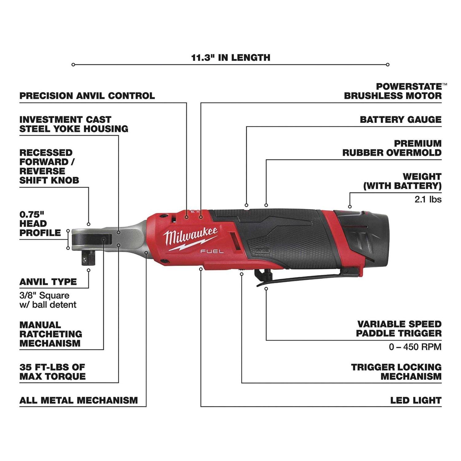 Our M12 FUEL 3/8″ High Speed Ratchet Kit is part of the latest addition to our best-in-class lineup of ratchets. This MILWAUKEE cordless ratchet kit features the fastest speed while installing and removing fasteners. The most compact head size in its class gives you more access in tight spaces. A steel yoke housing and POWERSTATE Brushless Motor deliver the superior durability that you expect from Milwaukee. The M12 FUEL High Speed Ratchets are an ideal addition to any technician tool chest, allowing you to be more productive than any other battery-powered ratchet.