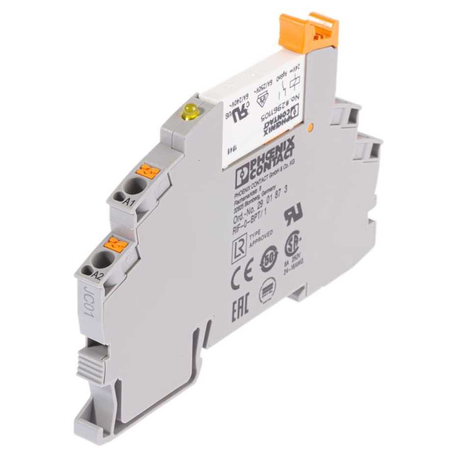 Coil voltage = 24V dc contact arrangement = 1 pole normally open contact Switching current = 6 A Connection type = Pluggable Coil resistance = 3.388 kΩ Switching voltage AC max. = 250V ac Switching voltage DC max. = 250V dc Application Type = Power Length = 6.2mm Depth = 66mm Height = 93mm Dimensions = 6.2 x 66 x 93mm Operating temperature min = -40°C Relay power module RIF0. Professional series of power relays consisting of a relay base with ejector and a relay with multilayer gold contact or power contact. Easy wiring thanks to plug-in connection technology Easy handling and extension of the range Plug-in display/interference suppression module Options with 1 and 2 contacts 5 ms typical response time Yellow LED signal light Protection circuit with damping diode.