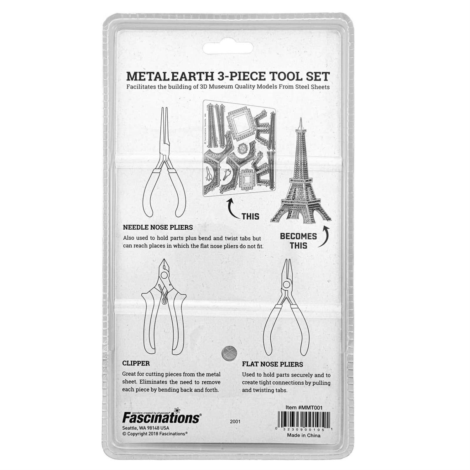 This handy Metal Earth 3 Piece Tool Kit was designed specifically for working with Metal Earth laser cut steel models. Whilst the tools are not necessary for assembling your models, they can make it quicker and easier if you are putting several models together to complete a collection, or would like a more precise assembly and finished product. Also ideal for any DIY model maker. Your kit includes a clipper for cutting out pieces, flat nose pliers for holding pieces and connecting tabs, and needle nose pliers for smaller, more delicate pieces. Each tool has been heat treated for the ultimate in long life quality. Recommended for ages 14 and up.