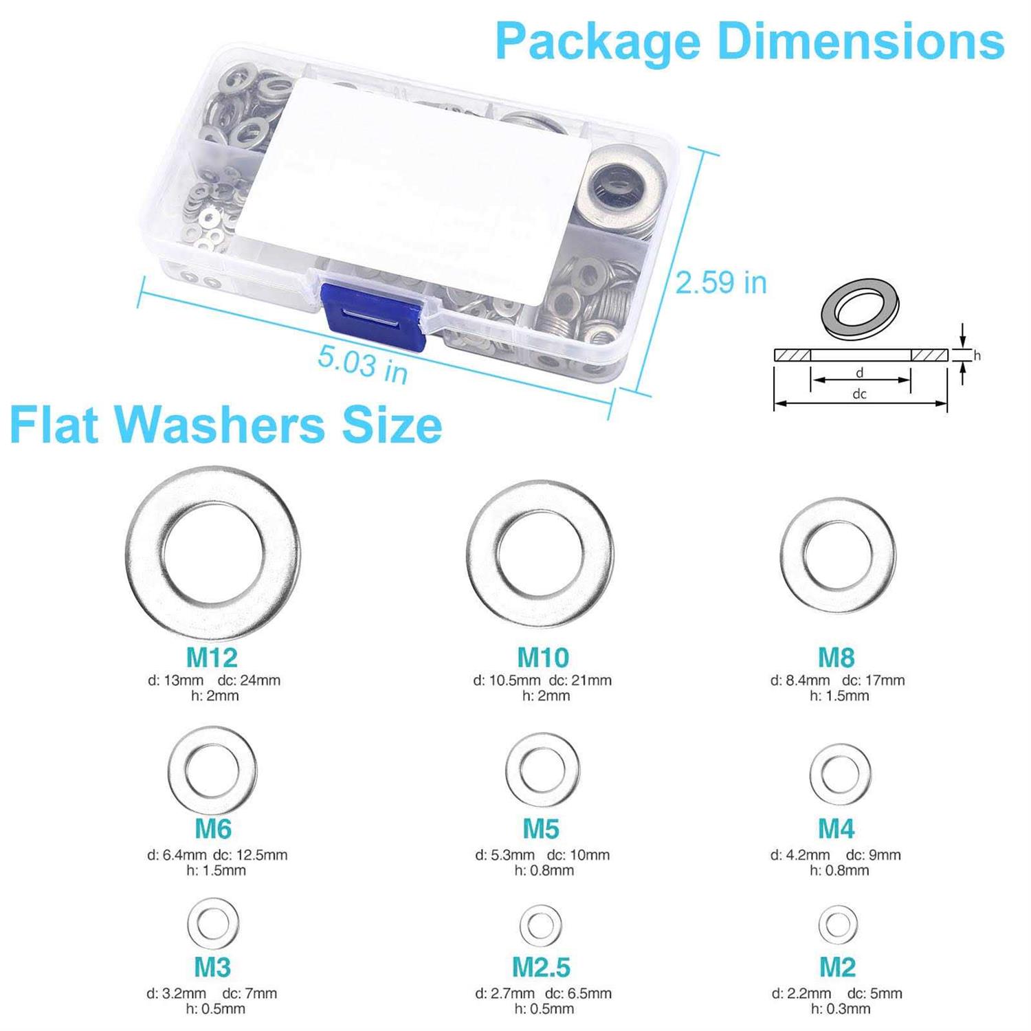 Flat Washers by YLYL. Help you Perfect for interior decoration, outdoor construction, electrical maintenance and furniture repair, Widely meet your various home DIY or automotive demands etc.04*2.67*0.9 inch/12.8 * 6.8 * 2.3 cm – Sizes: M2 M2.5 M3 M4 M5 M6 M8 M10 M12 Fender washers assortment set Material: made of top 304 stainless steel which has the advantages of high hardness, well wear-resistance corrosion resistance and rust resistance. Which can ensure long time using even in bad environment like high temperature, cold weather, and high humidity areas. Tips: Small parts, keep away from children under 6 years old. Be sure to Add to Cart. Package Includes: – 210pcs X M2 – 200pcs X M2.5 – 100pcs X M3 – 100pcs X M4 – 70pcs X M5 – 40pcs X M6 – 50pcs X M8 – 20pcs X M10 – 10pcs X M12 .