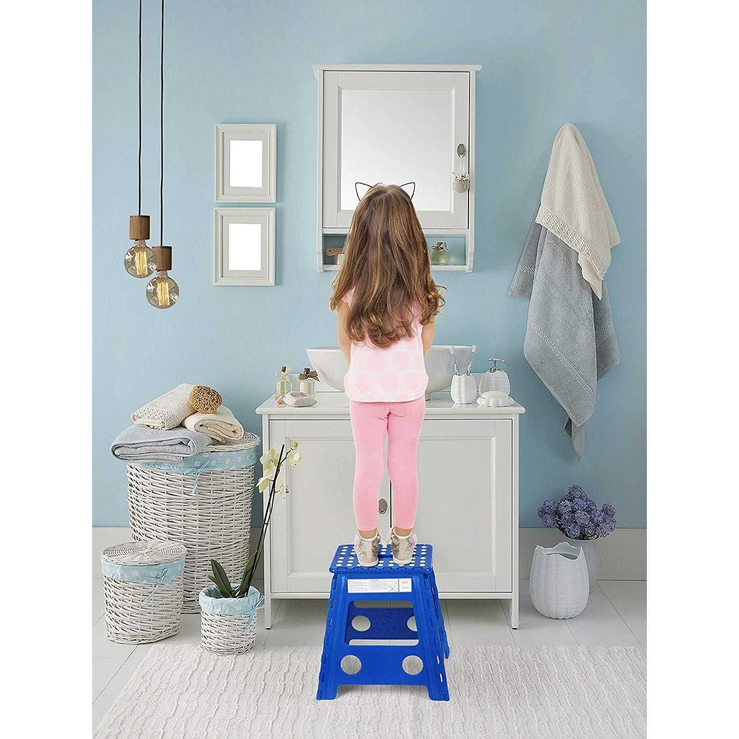 Four round corner super safe protect your body from clashing. 【Space Saving Foldable Stool 】: This foldable step stool is super convenient. It’s quickly and easily folds away for convenient storage so you can opens with one flip of the hand.