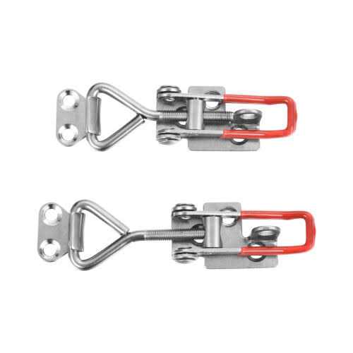 Toggle Latch Clamp: Model: GH-201-B; Holding Capacity: 163Kg/360Lbs; the size of the hole is 6 mm (L x W); Arm opens 85? while handle moves 80?. Material: Cold-rolled carbon steel with zinc plated coating for corrosion resistance; Oil and stain resistant red vinyl hand grip. Easy Install: Simply attach them to the door or box with screws and you can easily install them (M4 or M5 screws, doesn’t come with screw). Application: A rock-solid grip to install on jigs, tool fixtures, or movable bases, during clamping, the lever is controlled to prevent impact on functioning due to side thrust. Hold-down toggle clamp, u-shaped clamping bar, ideally suitable for quickly holding down circuit boards, paper, for machine operation, welding, jigs to sand, cut, router, etc.