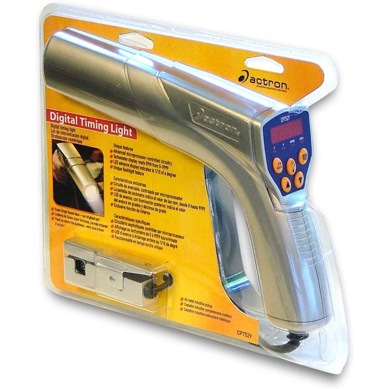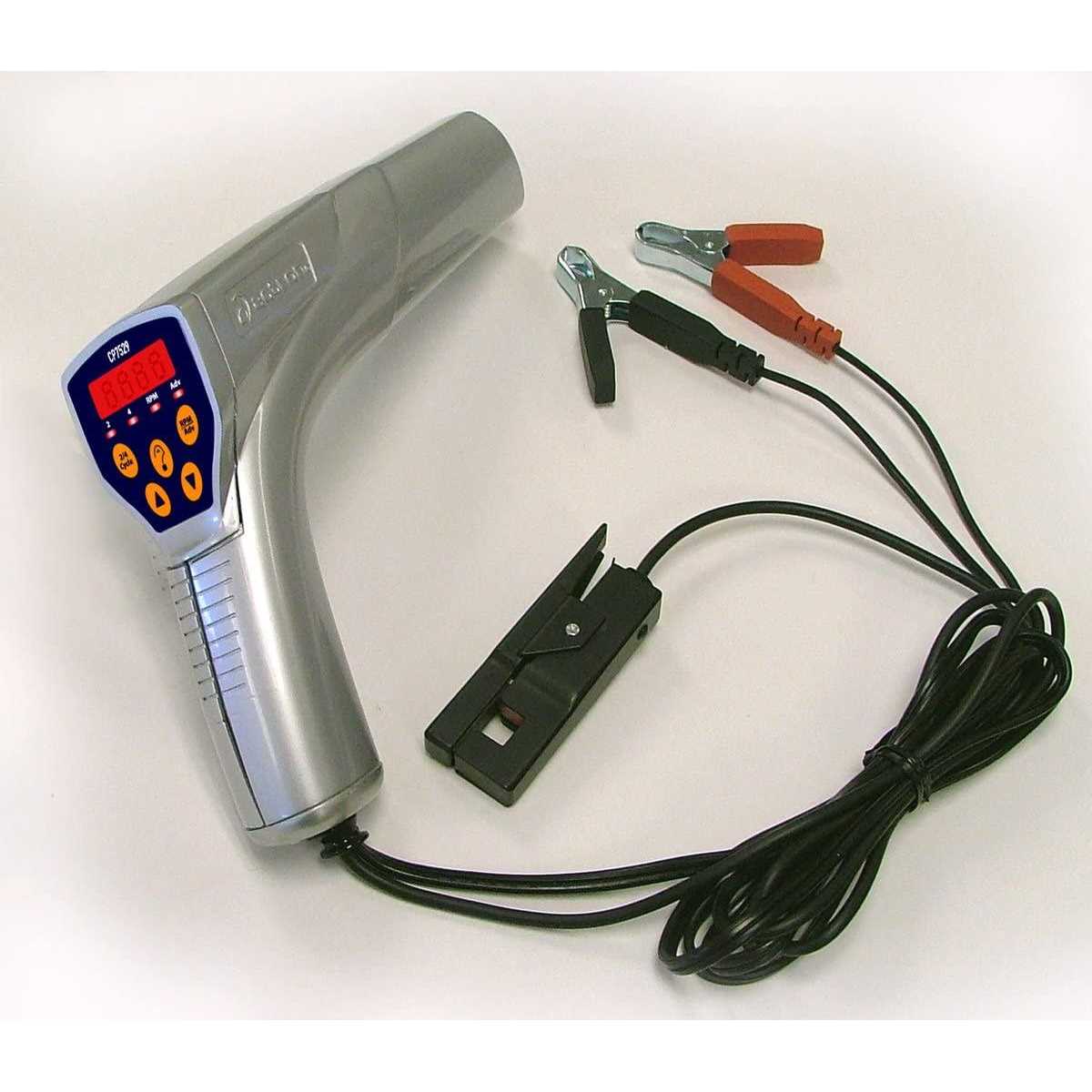 Actron CP7529 Digital Timing Light with Advance, Tachometer, Flashlight, and LED Display, GrayActron’s CP7529 Digital Timing Light features microprocessor-controlled circuitry and is loaded with advanced features including a bright LED display, mode indicator lights, and flashlight. The ideal timing light for the heavy do-it-yourselfer or professional technician. Use to measure engine RPM and advance, and set initial timing, check and measure centrifugal advance, and measure vacuum advance. Works on gasoline powered vehicles equipped with conventional, electronic, computer controlled, DIS, or 2-cycle ignition systems. Digital LED tachometer display reads 0-9999 RPM. Advance display indicates to 1/10. Handy 2/4 cycle and RPM/advance mode lights help you keep track of settings and multi-task. RPM/advance selector button and up/down buttons that increase or reduce the advance make operation simple and easy. Features a super bright Xenon flash that makes it easy to see timing marks – even in daylight. The all-metal inductive pickup and durable ABS housing offer rugged reliability while heat resistant over molding on battery clips prevents burned fingers. Works on 6V and 12V vehicles (6V use requires a separate 12V automotive battery for power).