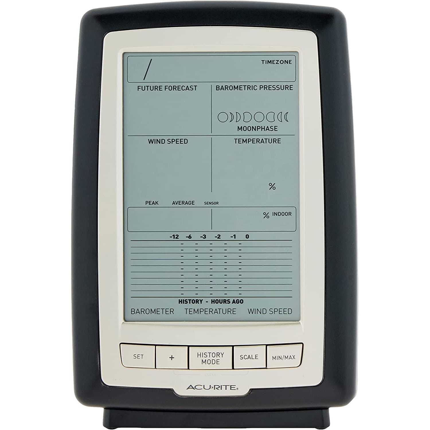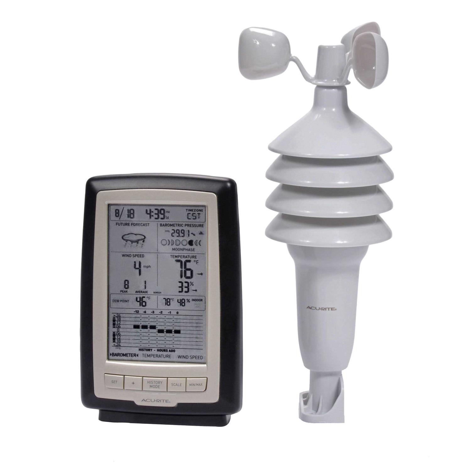 Never let the weather catch you unprepared again with the Acu-Rite 00638A3 Wind and Weather Center. Accurate 12- and 24-hour future forecasts feature 14 different weather icons, giving you an excellent idea of what the weather will do. The station also tracks wind speed and wind chill as well as history and trends for indoor and outdoor temperatures, indoor and outdoor humidity and barometric pressure. Enhanced 433MHz signal strength penetrates walls from up to 330 ft. away. Atomic clock and calendar make setup easy and automatically adjust for Daylight Savings. Displays moon phase. Main unit requires three AA batteries (not included). Main unit: 7.75H x 5.1W x 1.1D. Outdoor sensor: 11.1H x 5.25 dia. Gender: Male. Age Group: Adult. Type: Weather Stations.