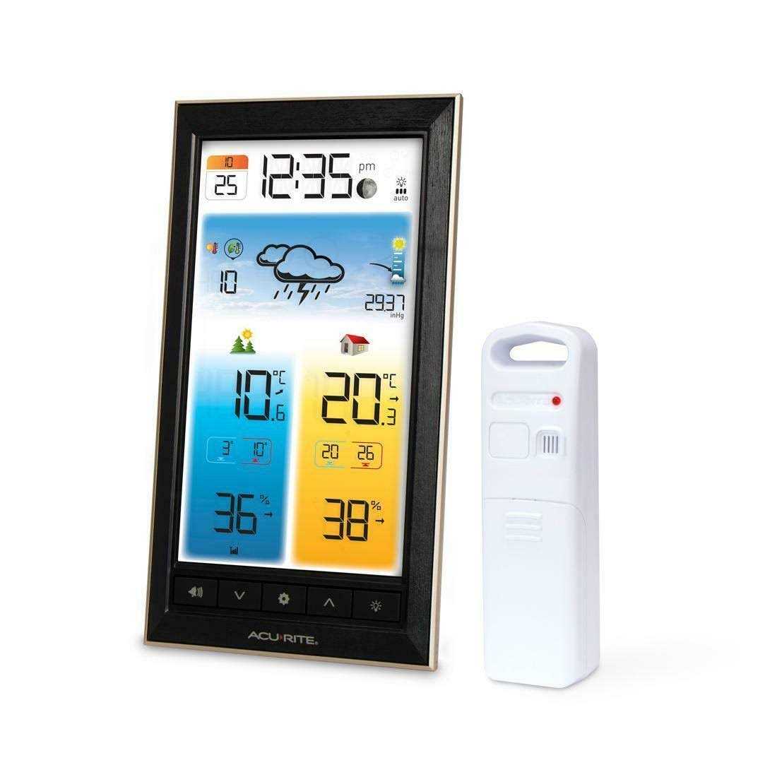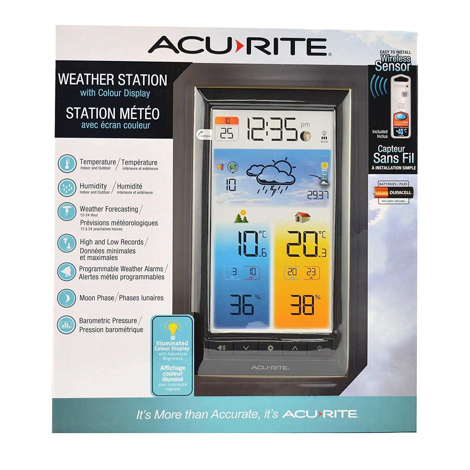 Stay connected to the things that matter most with the AcuRite Digital Color Weather Station. This weather station features an easy to read color display that looks attractive for any room. Its vertical design uses minimum counter space for convenient placement as well. The weather station shows information for indoor outdoor temperature Fahrenheit or Celsius and humidity with daily highs low records dew point heat index moon phase barometric pressure with trend indicator clock and calendar. Set alerts to be notified when conditions are outside of your preferred range allowing you to plan your day with confidence.