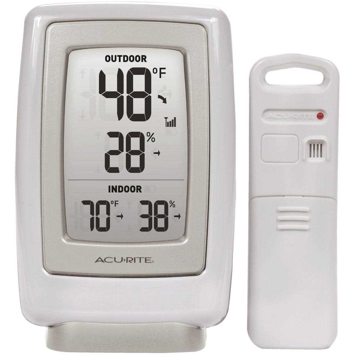 Chaney Plan the day with confidence with your own accurate and up-to-date information – right from your own backyard. The AcuRite digital indoor / outdoor Thermometer and humidity monitor features precise, reliable temperature and humidity readings. The bold, easy to read LCD screen displays the current indoor / outdoor temperature and humidity with a temperature trend indicator arrow and daily high / low information. Display stands upright for tabletop use or is wall-mountable. The outdoor sensor features powerful wireless technology, weather-resistant construction and an integrated hanger for easy mounting. It’s more than accurate, it’s AcuRite.