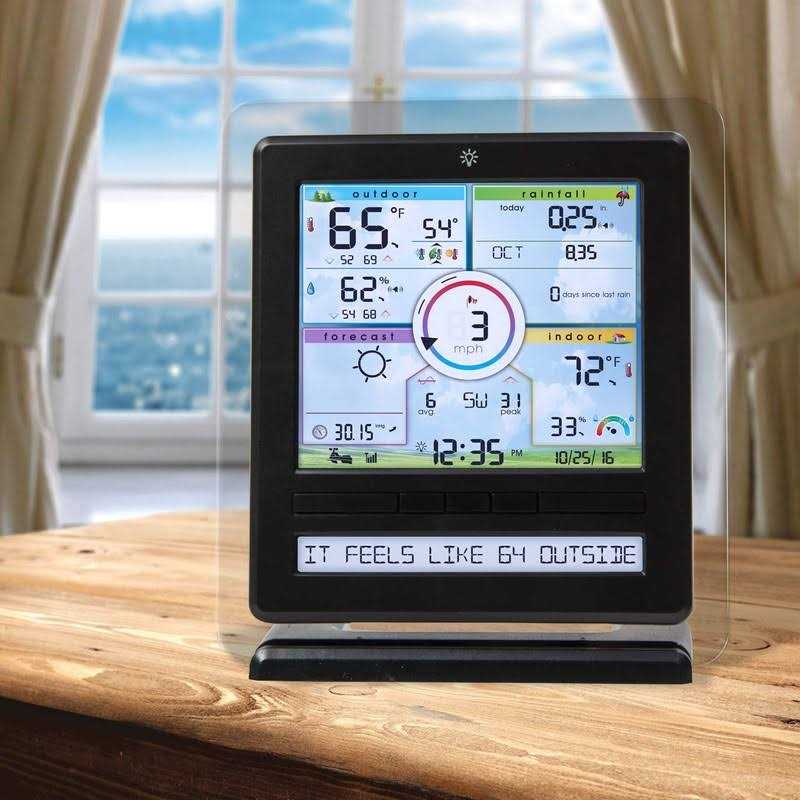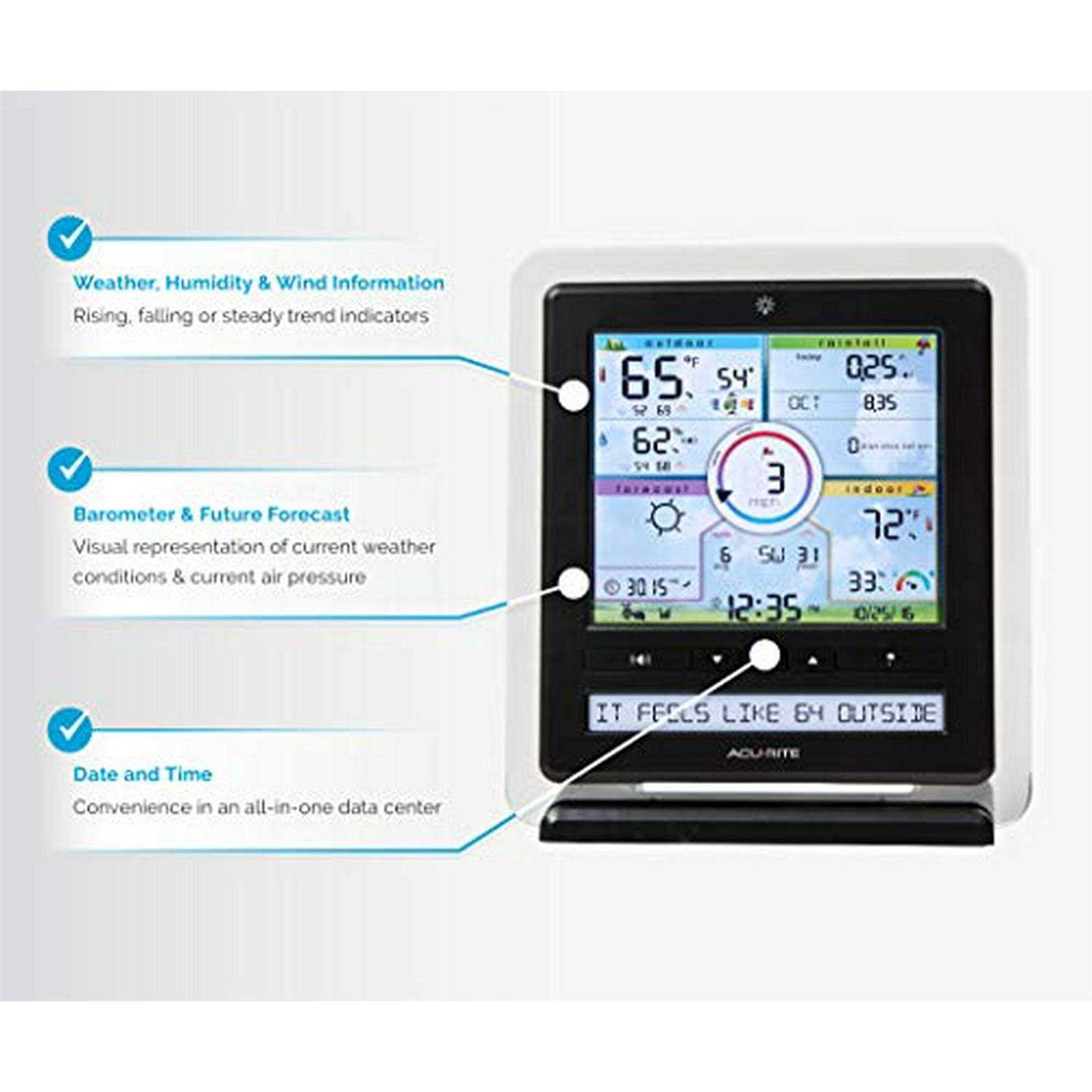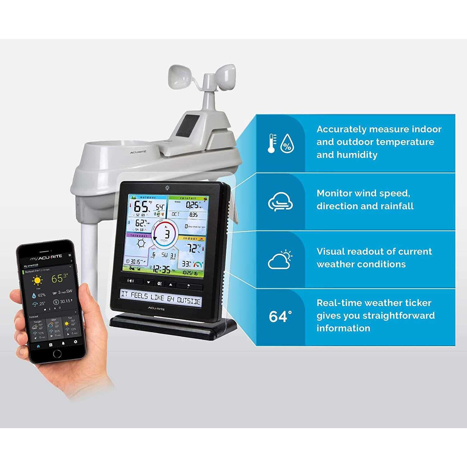 Accurately measure temperature, humidity, rain, wind speed, and wind direction with the 5-1 Professional Weather Station. It features a color display with weather ticker, giving you real-time information at a glance. Conveniently view your weather sensors from virtually anywhere on a smartphone, tablet, or computer using the My app. This weather station also includes a USB port for your computer to store, track, and analyze weather history. Easily share your weather station forecasting data with weather communities like Weather Underground. One-year limited .