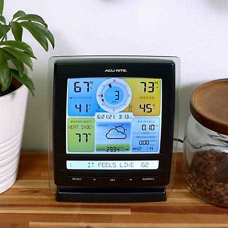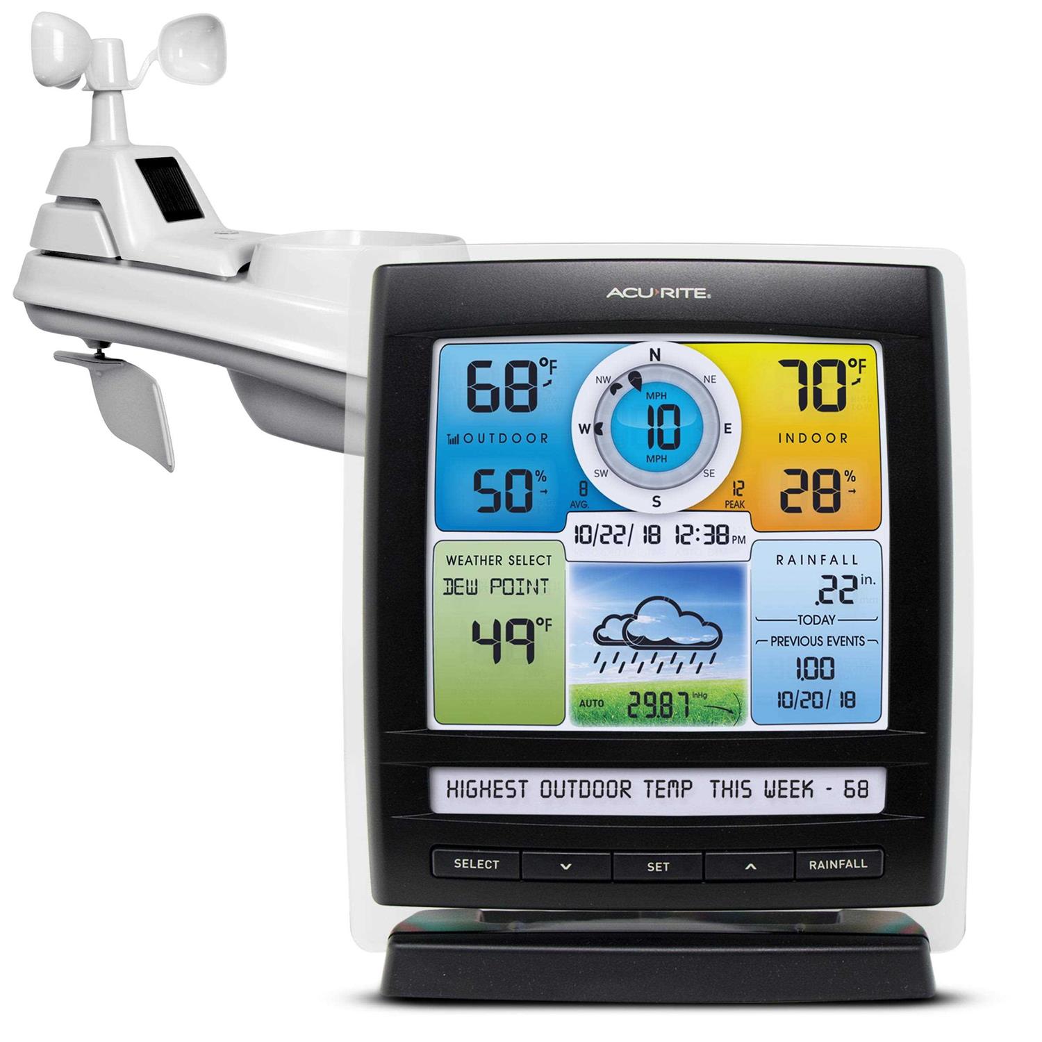 Get the weather forecast and temperature information to plan your day with confidence with AcuRite’s Pro Color Weather Station. The weather station’s illuminated color display features indoor and outdoor temperature and humidity, rainfall, wind speed/direction/chill, the weather forecast, heat index, dew point, wind chill, wind direction gauge, barometric pressure with 12-hour history, time, and date. Display stands upright for tabletop use or is wall-mountable. The AcuRite Professional Weather Station uses patented Self-Calibrating Technology to provide your personal forecast of 12 to 24-hour weather conditions. Self-Calibrating Forecasting is generated from weather data measured by the 5-in-1 sensor in your yard – giving you the most accurate forecast available for your exact location. The patent-pending 5-in-1 sensor is easy to set up, includes mounting hardware, and features a 2-year battery life for maintenance-free operation. It’s more than accurate, it’s AcuRite.