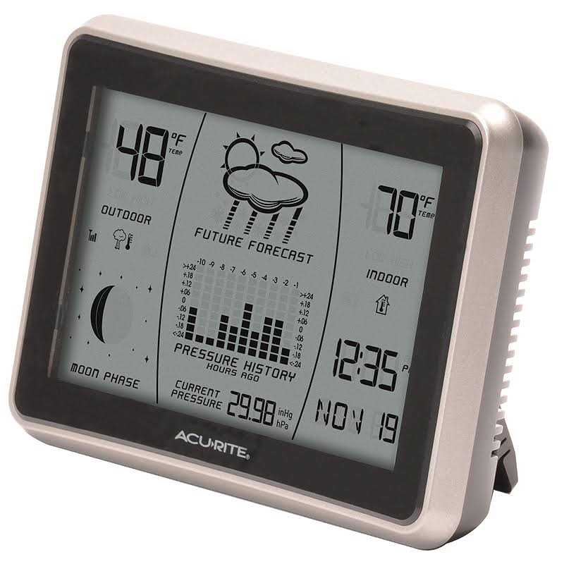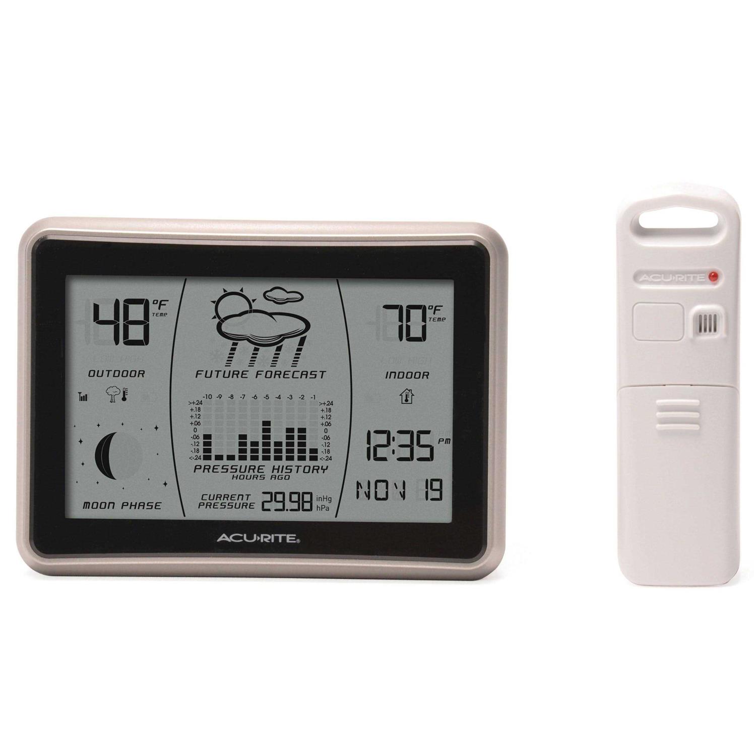 Wireless weather forecaster, indoor/outdoor temperature, degree F/C selectable, daily highs and lows. Icon displays 14 different weather conditions. Patented self-calibrating forecasting, IntelliTime self-setting clock (hr/min/sec). Resets automatically for DST. Calendar date and month, moon phases for hunters. Folding stand or wall hanging mounting options. Wireless signal strength indicator. 40 to 158 degrees Fahrenheit;. 4 degrees Fahrenheit /. 20 degrees Celsius Data Reporting 30 second updates Dimensions 4.