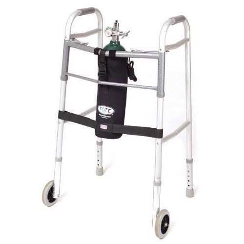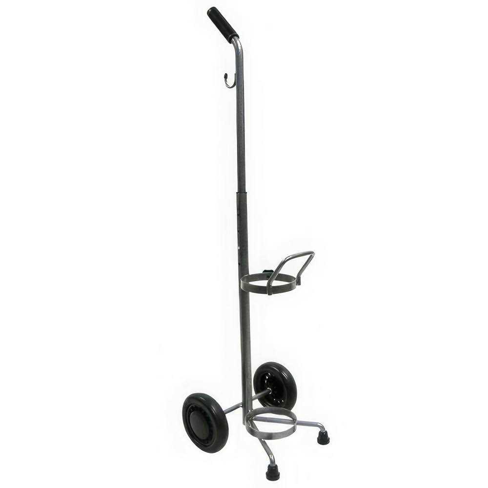 Easily transport your oxygen tank with the Adjustable Oxygen Cart. This lightweight cart has large composite wheels, so it is easy to pull and maneuver. The Adjustable Oxygen Cart’s handle adjusts from 39.5 to 44 inches to accommodate most individuals. Two rubber feet are located near the front of the cart and allow the Adjustable Oxygen Cart to stand upright while stationary. This cart can easily fit either “D” or “E” size oxygen tank cylinders. Lightweight cart in with a silver finish. Handle adjusts from 39.5″ – 44″. Large composite wheels allow for safe and easy maneuvering. Easily fits eithier “D” or “E” size oxygen tank cylinders.