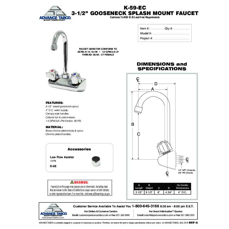 The Manual Faucets by Advance Tabco: Special Value Faucet, 4 O.C, splash mounted with 3-1/2 gooseneck spout, lead free ( Advance Tabco – K-59-EC ) – This Advance Tabco K-59-EC faucet comes in a splash-mounted design, providing a great amount of space between the faucet and sink bowl for a much larger capacity. This economy faucet is great for easy accessibility due to its canopy-style handles. Its handles have colored indexes so users know which side is hot water and which side is cold water. With a tall spout and swivel gooseneck design, this faucet mounts on 4-inch centers. Product Details. Canopy-style handles with colored cold and hot indexes. 31/2-in. swivel gooseneck spout. Chrome-plated brass body and spout. 1.0 GPM/3.8 LPM aerator. 4-in. centers. 60 PSI. Overall dimensions: 43/4 in. D x 91/2 in. H.