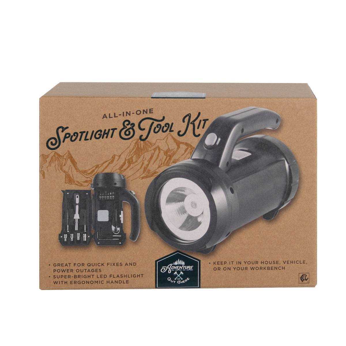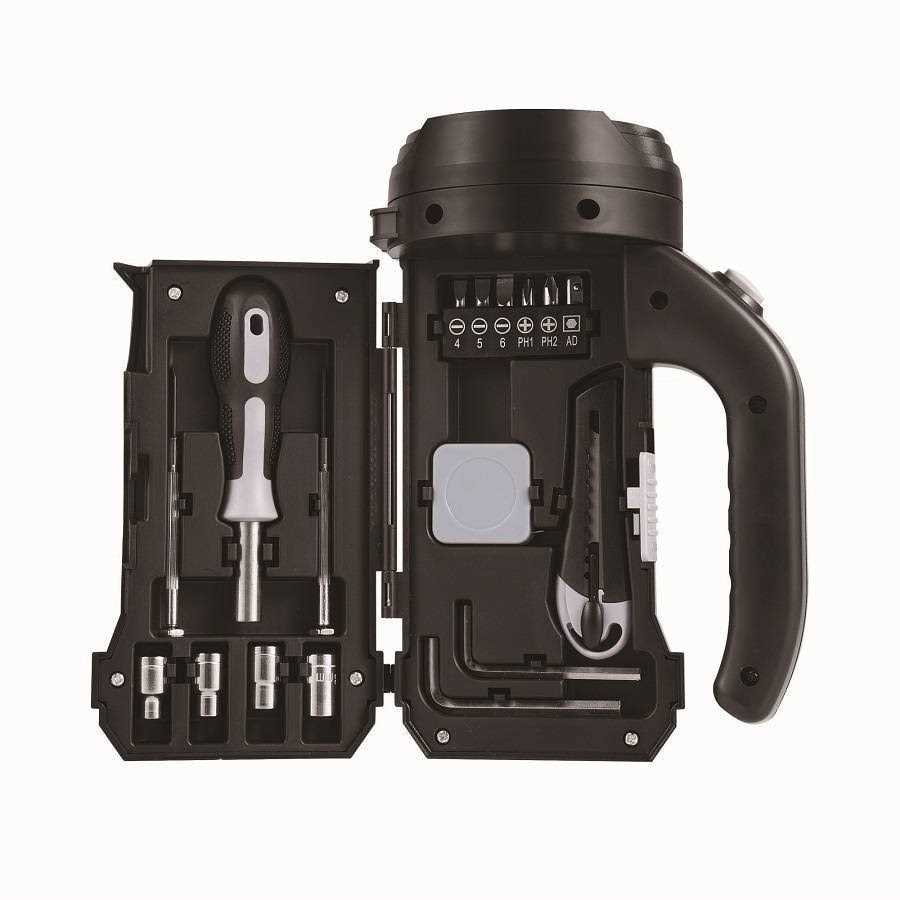 You will be well prepared with this all-in-one Spotlight and Tool Kit. The 18 piece tool set is conveniently stored inside the body of the super-bright LED flashlight, which makes it ideal for quick fixes and power outages. The compact ergonomic designed handle makes the spotlight comfortable to hold and allows for unobtrusive storage in a drawer, vehicle, or on your workbench.