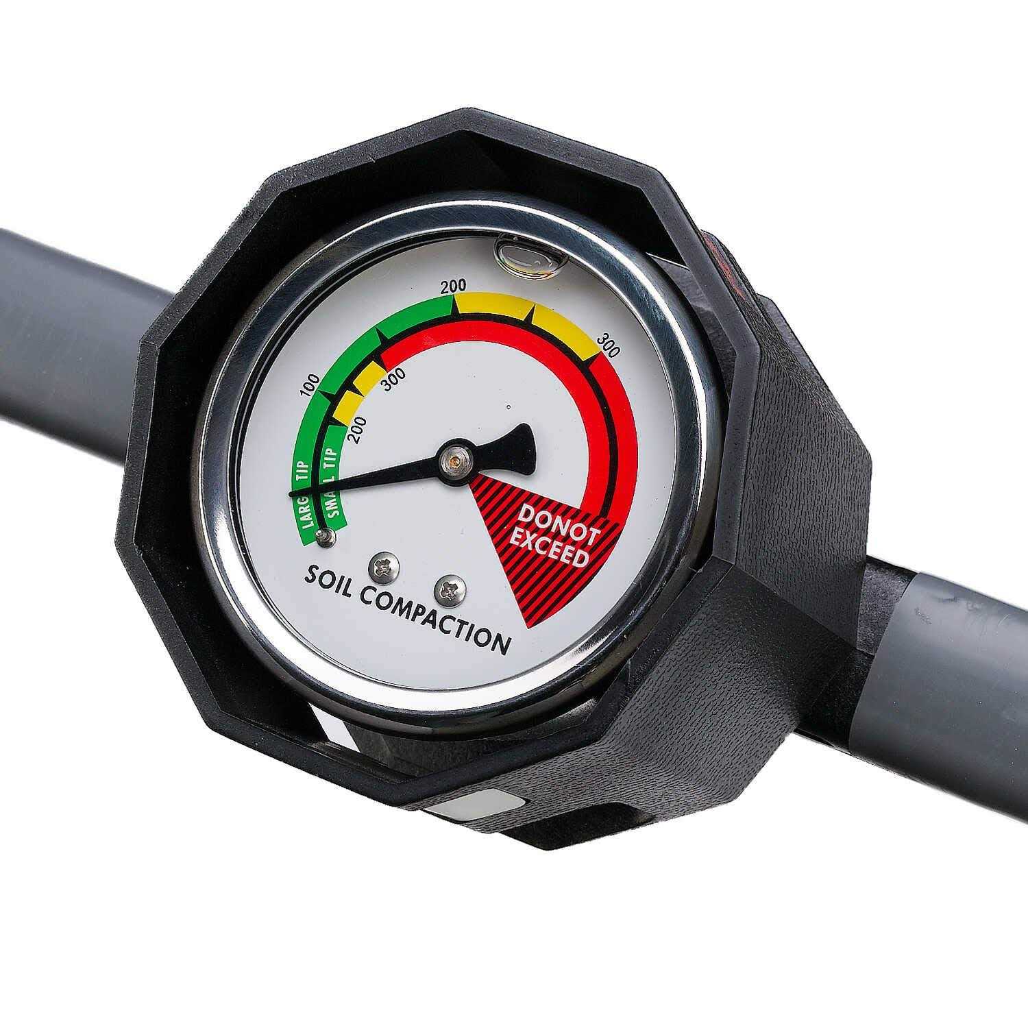 Features a Durable Molded Housing and Rubber-Grip Handles Soil Compaction Meter measures the extent and depth of subsurface compaction. Durable 24″L Meter has a gauge with color-coded dial to indicate whether growing conditions are Good, Fair or Poor. Adjustable shock collar prevents gauge damage during transport and storage. Compaction measurements help optimize water retention, foster healthy root development and increase the effectiveness of fertilizers, pesticides and herbicides. Includes two self-storing tips; a 3/4″ tip for soft soil and a 1/2″ tip for firm soil. Reads from 0 to 200 psi for good conditions; 200 to 300 psi for fair conditions; and 300+ psi for poor conditions. Durable Molded Housing and Rubber-Grip Handles