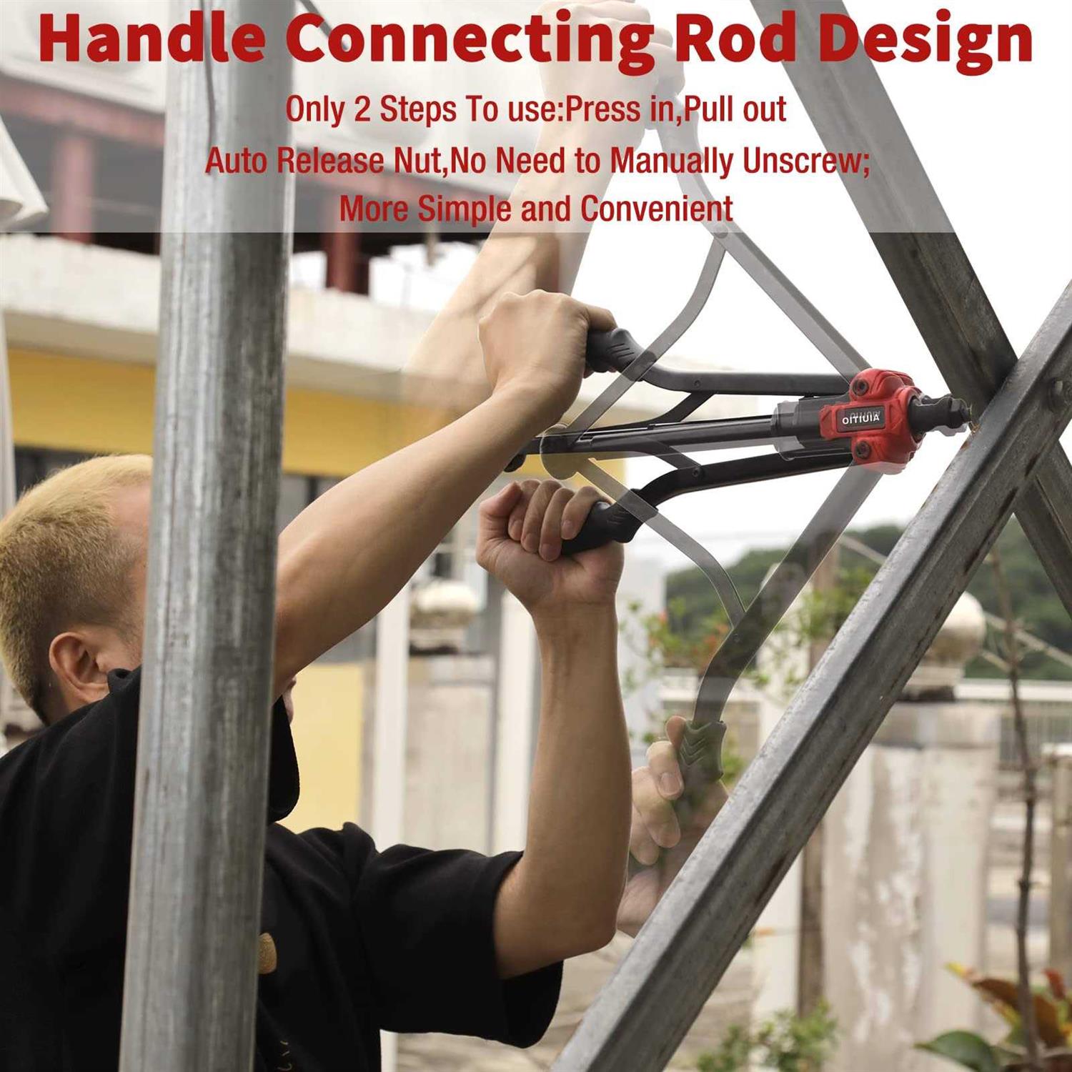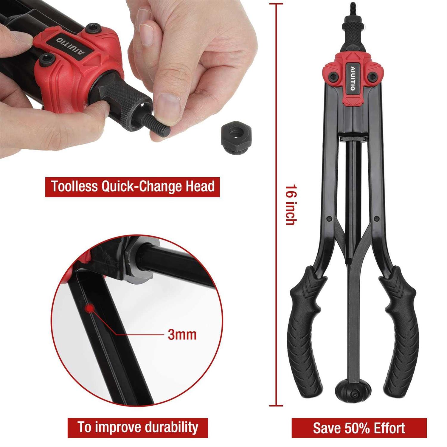 EXCELLENT DESIGNHandle connecting rod design, quick release nut structure. Its design makes it easier to rivet nuts. In addition, when the nut riveting is completed, the open handle automatically exits the nut. No need to manually unscrew. It saves 90% more time and effort than a normal rivet tool.New “Toolless Quick-Change Head” design allows for easy changing of mandrels and nose pieces by hand.. Labor-saving & DurableThe 16-inch carbon steel arm is heat-treated and has anti-corrosion and anti-deformation functions. It can maximize leverage and is more powerful and labor-saving than ordinary 14-inch rivet nut tools. Non-slip rubber handle makes you more comfortable to use.. Wide ApplicationsProvide a customized fastener solution for wide riveting applications, such as body panels, bicycle attachments, furniture and decorations, especially for off-road / Jeep modifications..,,AIUITIO