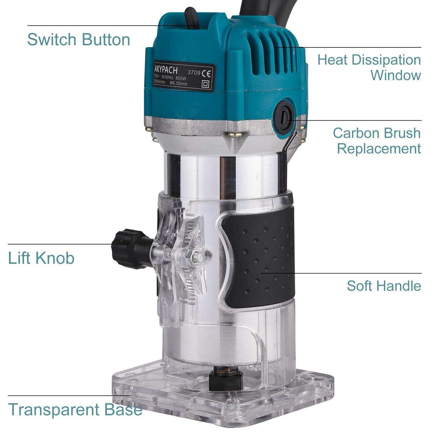 Brand: AKYPACHFeatures: 【Top quality】-The wood router is made of high-quality aluminum + plastic, equipped with a shock-absorbing soft handle, which can increase comfort and durability. Durable and long service life. It has a durable handheld router structure, advanced electronic equipment and reliable ergonomic design. Anti-overload/anti-scalding machine/fast heat dissipation. 【Power supply design】-The input power is 800 watts, the voltage is 110V, the chuck diameter is 6.35mm, and the power is 30,000 rpm. The 1/4″ motor can provide enough power for wiring and fine-tuning applications. Effective heat dissipation and protection of the machine. Anti-vibration, practical, simple operation, durable. 【High-precision and easy operation】-The router tool transparent base allows you to clearly see the trimming and easy operation. The transparent base design has high precision and is easy to identify during processing. Adjustable knob, scale can be adjusted. 【Stable and non-deformation】- wood router tool includes some accessories, such as wrenches, trimming guides, straight guides, etc. The trimming guide rail and the rollers run along the curve to ensure accurate cutting and fine curve processing. Linear guide rail, thicker model is stable, no deformation, linear processing stable wooden wrench can tighten router head. 【Wide use】-This electric wood router machine is widely used in wood processing, cabinet processing, handicraft production, plastic board, wood veneer and other similar materials chamfering, grooving, surface treatment, curve cutting, wood edge planning, pattern processing Homework activities and DIY. Easy wood trimming and slotting.