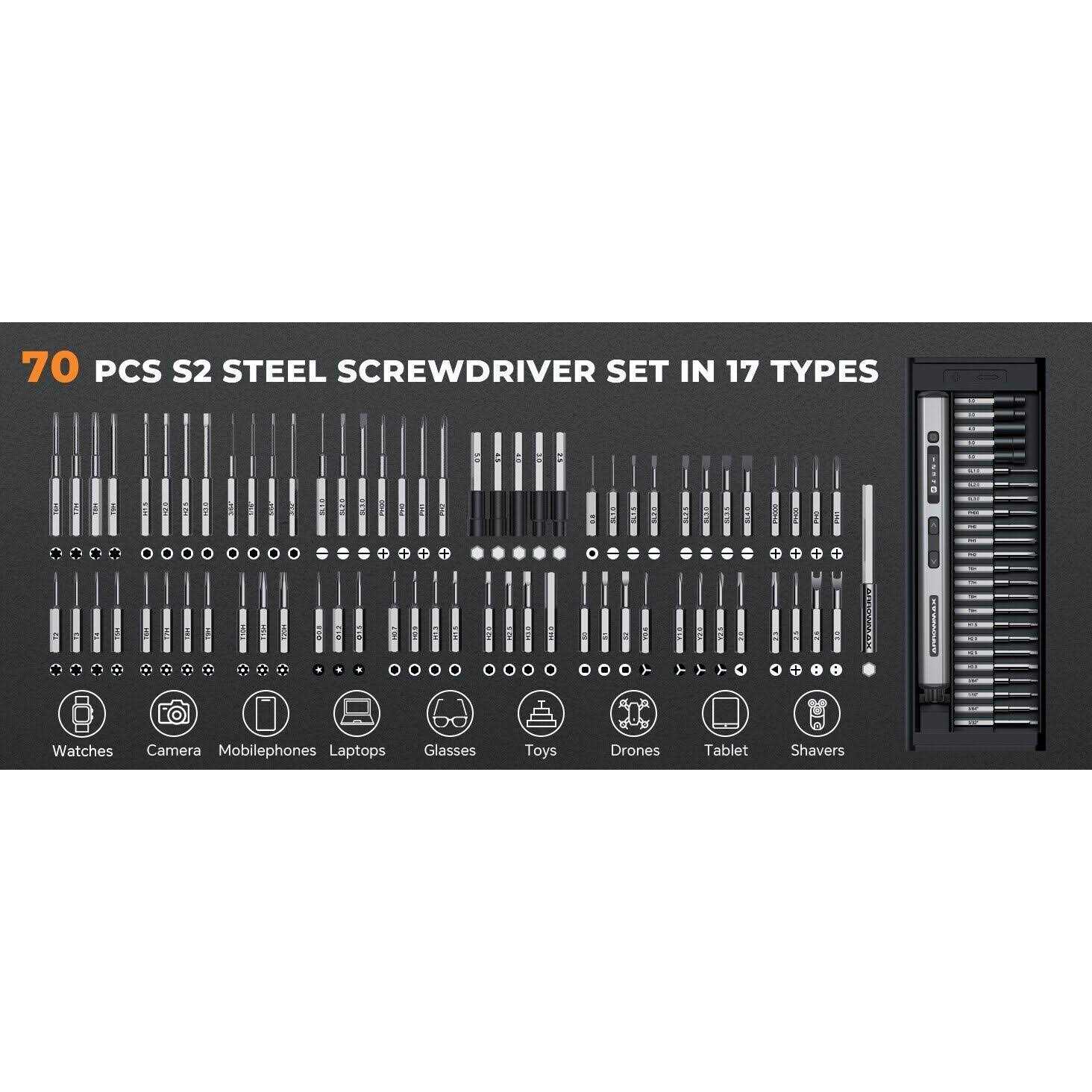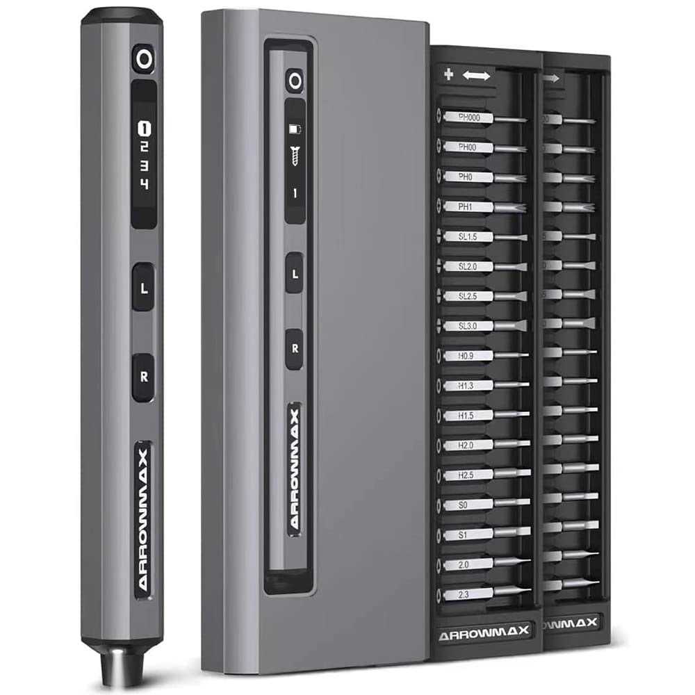 Small & Precise Power- SES Electronic Screwdriver Set is equipped with OLED screen and fine operation. This power screwdriver is also designed with 200r/min rotate speed, providing powerful performance and high work efficiency. SES Electric Screwdriver with a portable lightweight design offers you to carry easily as well. 4 Adjustable Torque & Dual Mode- SES Power Screwdriver has a high and low electric torque of 0.049 N.m- 0.20 N.m and a manual torque of 3 N.m. Buttons for forward and reverse of power screwdriver are clearly marked. Dual mode meet your requirement of tightening or loosening screw bits. Circular Arc Surface Design- SES Electric Screwdriver handle adopts a square shape with a circular arc surface, making it better to control the mini electric screwdriver during work and the grip is more comfortable.The pen-shaped body is ergonomically designed and easy to grasp. The circular arc surface allow arthritic hands to grasp without fatigue. 34 Bits For Multipurpose- The precision screwdriver set is equipped with 34 different types of bit. This power screwdriver can assemble and disassemble most of the 3C products, laptops, four-axis unmanned machines, glasses, clocks, toys, models, which is very suitable for people who likes electronic equipment. Long-Lasting Battery- SES Electric Screwdriver is equipped with 500mAh battery, long battery life, once you get this precision screwdriver set, you can use it for a long time without charging. In addition, this mini electric screwdriver can tighten a total of 900 screws. The USB-C port is convenient for you to charge at any time. Our electric screwdriver doesn’t charge off of USB-C PD chargers , it only supports USB-A to USB-C charging. Small & Precise Power- SES Electronic Screwdriver Set is equipped with an OLED screen and fine operation. This power screwdriver is also designed with a 200r/min rotation speed, providing powerful performance and high work efficiency. SES Electric Screwdriver with a portable lightweight design offers you to carry easily as well. Due to different monitors and light effects, the actual color of the item might be slightly different from the color shown in the pictures. AM ARROWMAX electric screwdriver kit does not come with a cable. Our electric screwdriver only supports USB-A to USB-C charging. While the electric screwdriver is charging, press the button to check the charging status. To ensure the best user experience, please fully charge it before its first use.