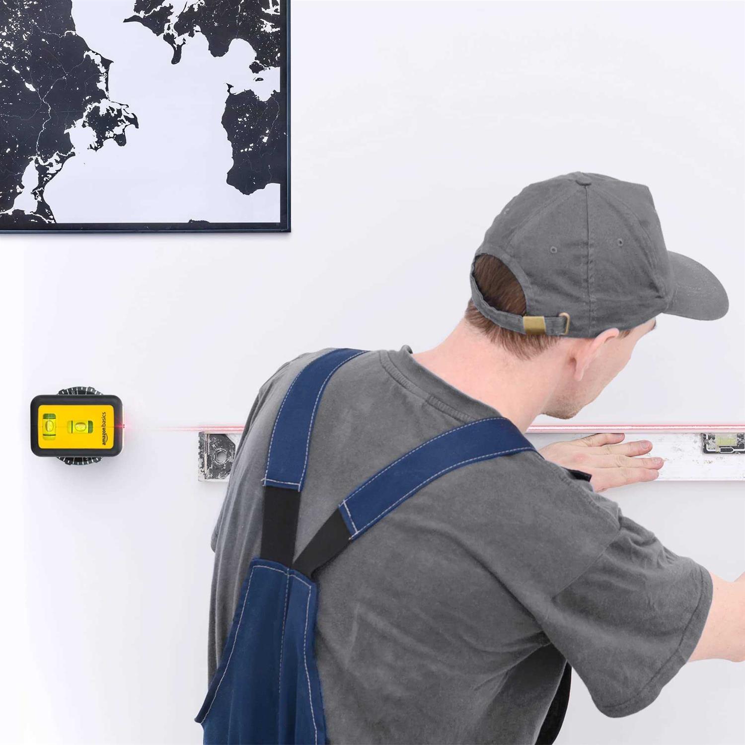 Laser level creates a visual aid for optimal accuracy when hanging or building items, indoors or out Includes a noise-free laser level with a class II, 16-foot laser that’s steady, clear, and consistent 360-degree rotating wall attachment makes it possible to project a line at any angle 2 extra-large backlit bubble vials provide maximum accuracy and easy viewing Made of durable plastic and metal for long-lasting strength AA battery operated (batteries not included) Product dimensions: 4 x 4 x 3 inches (LxWxH)