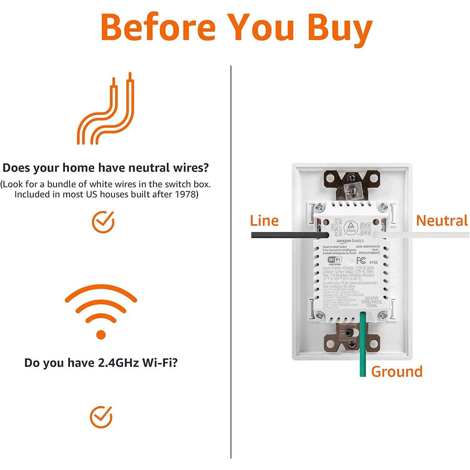 • SETUP REQUIREMENTS: Neutral wire and standard outlet box required (at least 2-inch deep), 2.4 GHz Wi-Fi