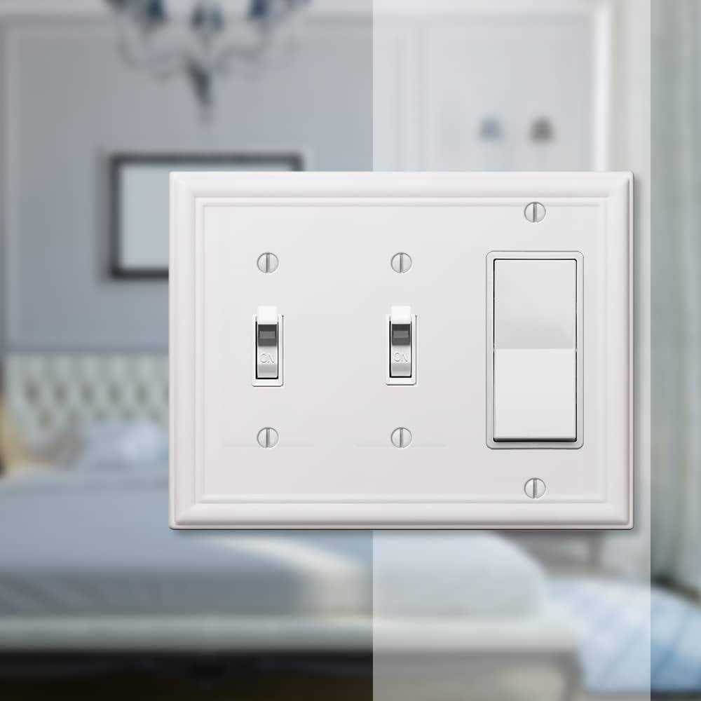 Manufactured by Amerelle, the leader in decorative wall plates and hardware. Made from durable stamped steel, this stylish wall plate does more than just cover electrical boxes, adding a simple elegance to your decor. Decorating with wall plates is an easy and inexpensive way to make an immediate impact in your home. They provide a charming upgrade to your standard plastic ones by adding a refined, decorative accent to any room in your house. High quality, durable stamped steel construction Quickly and inexpensively adds a stylish touch to your room Stylishly covers a 3 Gang 2-Toggle and 1-Rocker electrical box 3 Gang 2-Toggle and 1-Rocker wallplate cover Constructed of high quality, durable stamped Steel Easy to install with only a screwdriver Matching screws included for fast installation White finish provides stylish decor for your home Resists cracking, chipping, peeling and fading Additional configurations available so all your wall plates will match Identical to Hampton Bay Ascher/Chelsea wall plate family Add a decorative accent to your plain walls by installing this excellent Hampton Bay Ascher 2-Toggle and 1-Decora Wall Plate, White. Looks elegant.