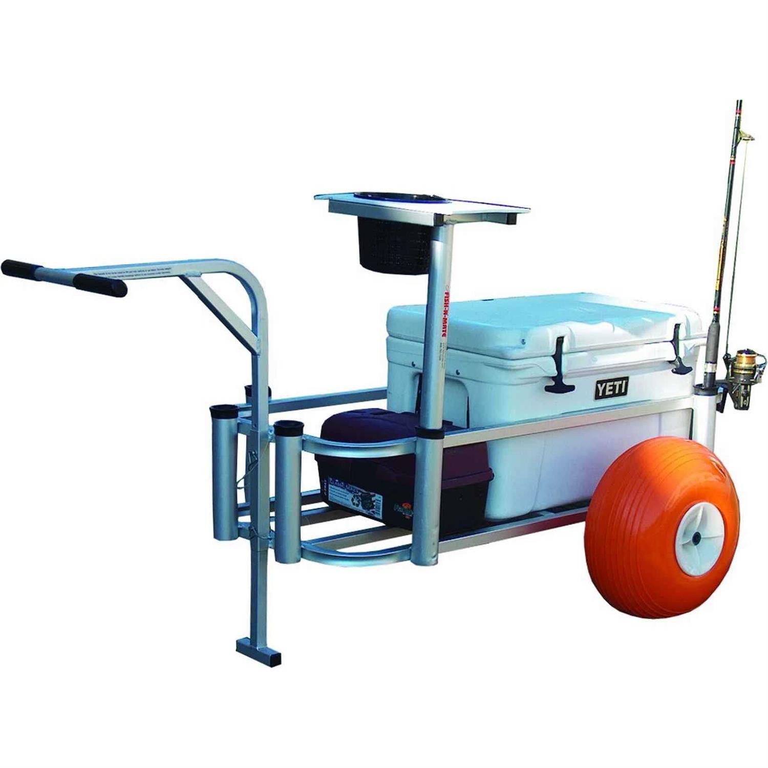 Use Angler’s Fish-N-Mate Standard Cart with Poly Wheels to take all your fishing gear from your car to the water in a single trip. One of the most versatile pier/beach carts on the market today, this cart has all the features a shore fisherman could want, including capped rod holders, low weight and balanced operation. Cart holds eight rods and reels, a 48-72-qt. cooler, a small bait cooler, a medium tackle box, lawn chairs and an umbrella. Marine-grade anodized-aluminum tubing with stainless steel hardware resists corrosion for long-lasting performance. Large 15″ dia. x 7″W poly wheels travel through soft sand with ease. Inside: 43″L x 16″W x 9″H. Wt. capacity: 200 lbs.