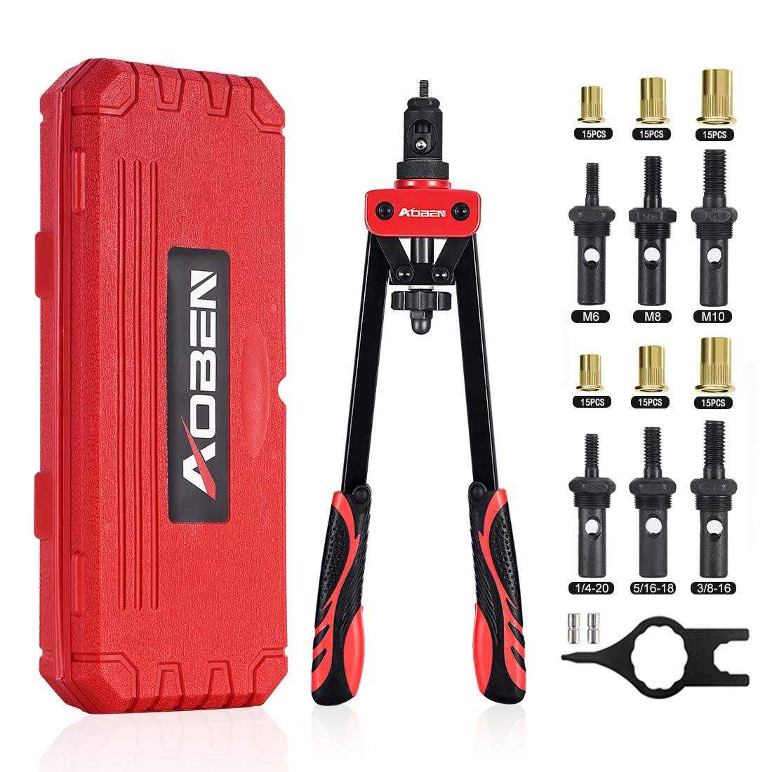 AOBEN 14 Rivet Nut Tool, Professional Hand Rivet Nut Setter Kit Labor-Saving and Compact Design Including 6 Interchangeable Mandrels 90pcs Rivnuts