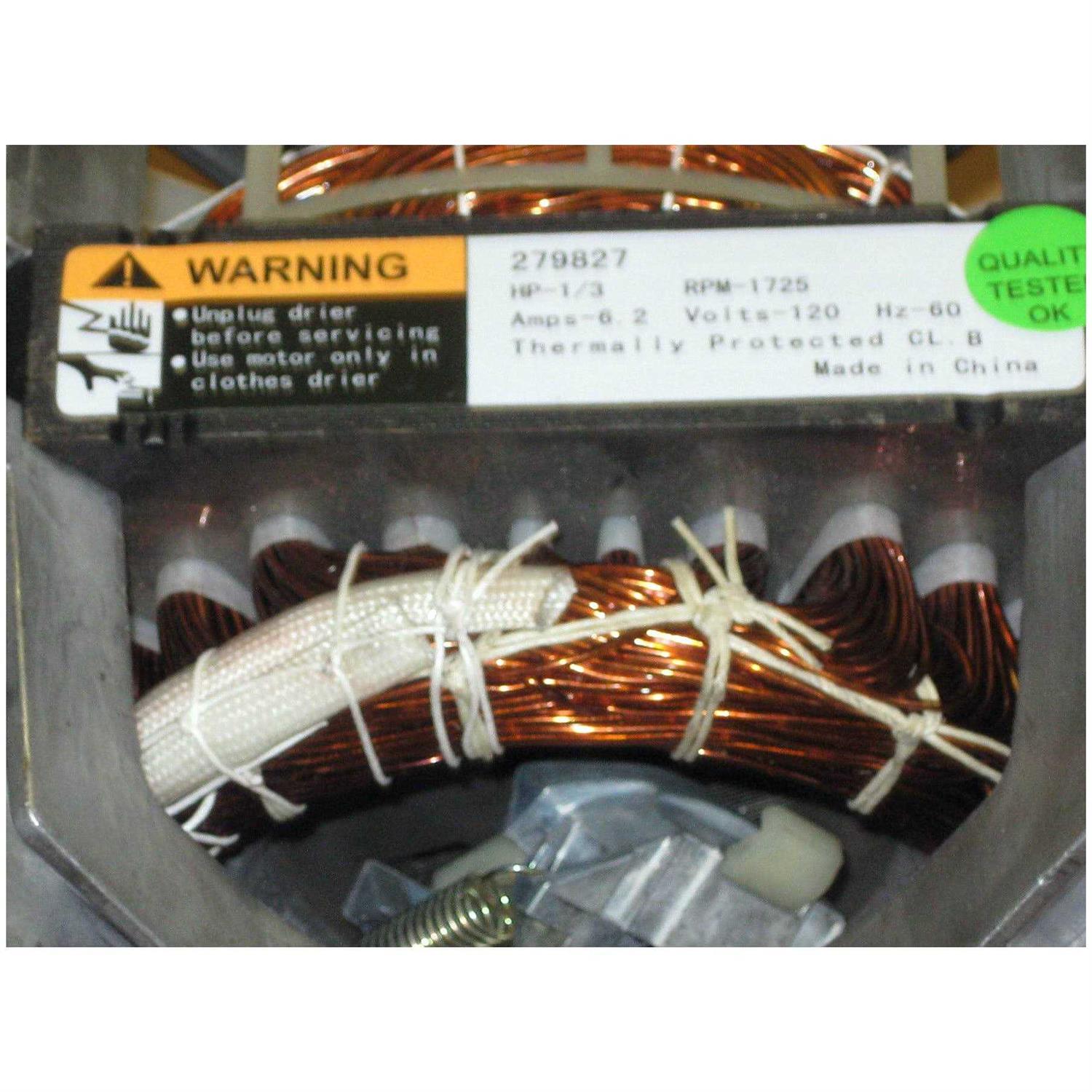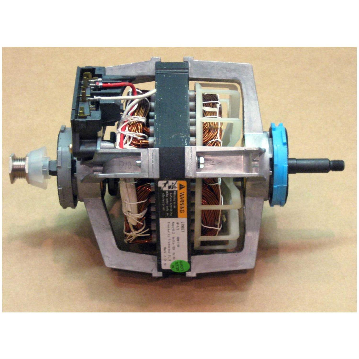 Part number 279827. Detailed installation and wiring instructions included. This motor replaces ‘s 695075, 695925, 3390033, 339088, 3391886, 3391887, 3391888, 3395652, 3976707, 8066207, ap3094245, ps334304 and others. This motor has 1-1/2in shaft on the pulley side pulley included and 1-7/8in shaft on the blower side, blower side shaft is threaded, lefthand threads. This dryer motor fits specific whirlpool manufactured models including roper, kitchenaid, kirkland and sears kenmore.