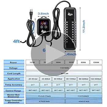 Aquarium Heaters & Chillers by AQQA. Details: AQQA–Aquarium accessories,Quality Assurance Product Name:AQQA Aquarium Submersible Heater Size:100W 200W 300W Voltage:110V/60Hz Cord length:4ft+5.9ft Controller:External Controller(Not waterproof) Temp Accuracy:±1°F Suggest fish tank size:25-35gallon 45-80gallon 80-95gallon Package included:1×heater with external controller 1×user manual 2×suction cups The main function of heater 1. Automatic heating, intelligently stop heating when the set temperature is reached 2. Dry burning-resistant protection, 5cm away from the water surface, automatic power off 3. The current water temperature and the set temperature are displayed at the same time, without mutual interference, the current water temperature can be seen at any time 4. Memory function, when the power is off, the previous settings will be maintained without resetting. If the heater have been in the fish tank, it will automatically start running after the power is turned…
