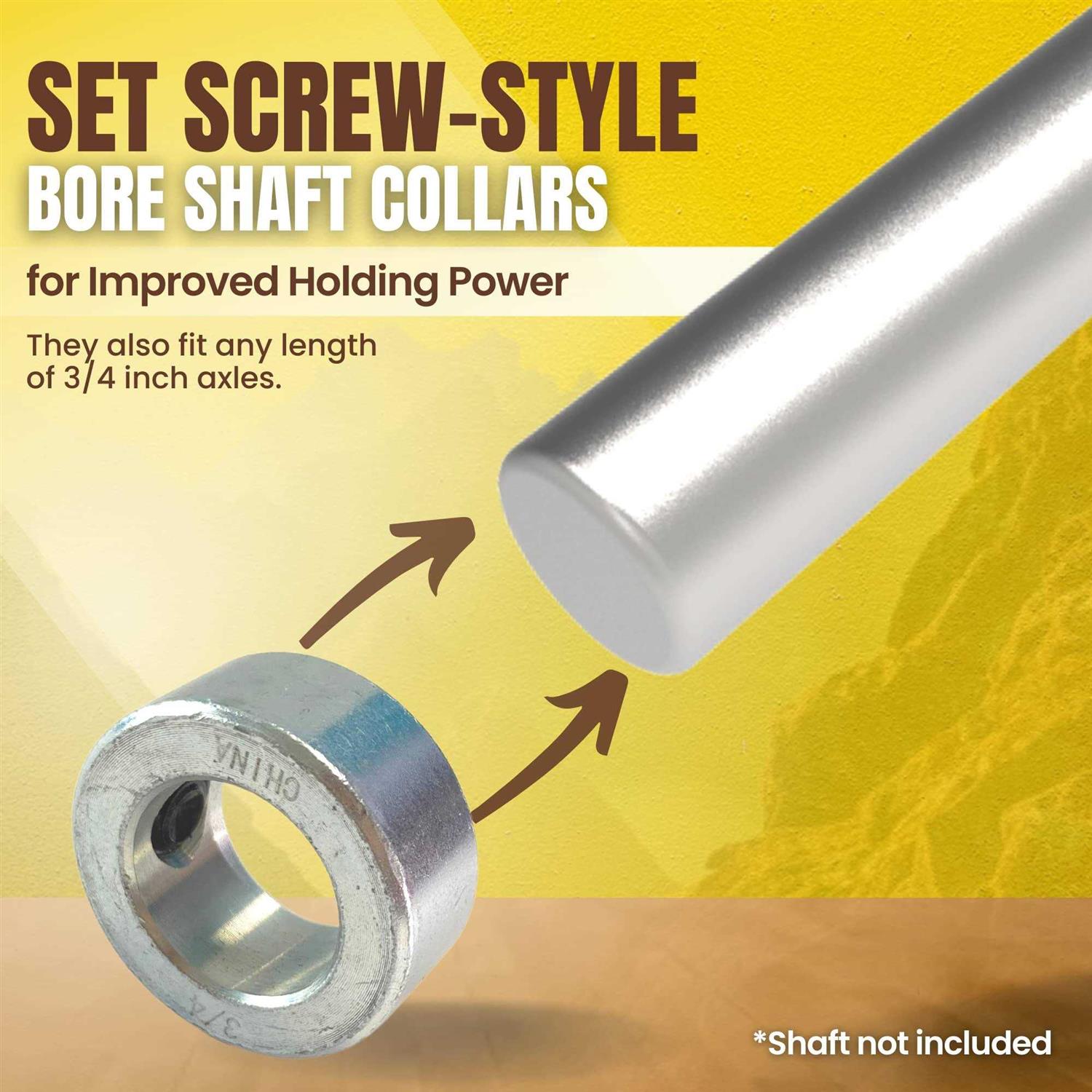 Precision Machined Shaft Collars All shaft collars in this pack have an exact 3/4 inch bore hole diameter (internal diameter), an outer diameter of 1 1/4 inches, and a width of 9/16 inches. Please note that when used with shafts or inserts with an outer diameter of 3/4 inch, it’s expected that the fit will be tight. The shaft collars are standard-sized. This is not a machining error. Versatile Use Shaft Collars Whether you are a DIYer or a repair expert, these shaft collars are very useful in different types of machinery and equipment. Suitable for many applications in automotive, machinery repair, and even medical equipment repair. Common uses include wheel stopper/spacer, bearing faces, component locators, and more. From keeping shafts centered to ensuring that the wheels won’t fall off, these shaft collars are must-haves. Shaft Collars with Set Screws for Better Holding Power Bore shaft collars with set screws perform better than other types of collars, especially when used on pipes and axles that are of softer materials that the shaft collar. The socket cup-point set screw can directly secure the collar to the shaft. And unlike push-on retainers, shaft collars are adjustable and reusable.