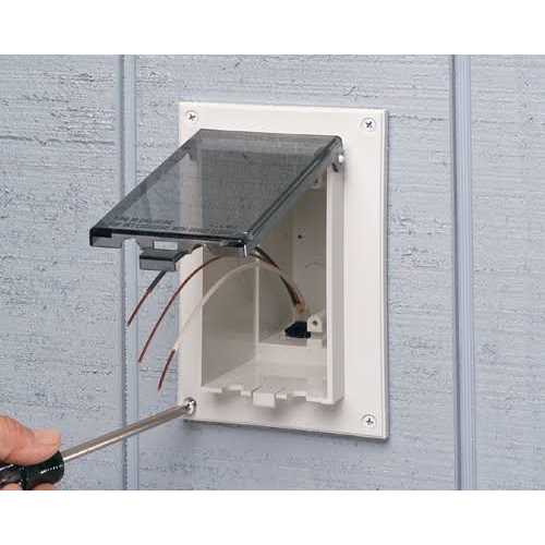 It comes with installed bug plugs, one standard duplex and one standard FGCI faceplate, one set installation screws, one NM cable connector and one roll of caulk for proper installation. This box is ideal for flat surface retrofit construction. It has NEMA 3R rating for safety. Box is UL listed, CSA certified and NEC compliant.