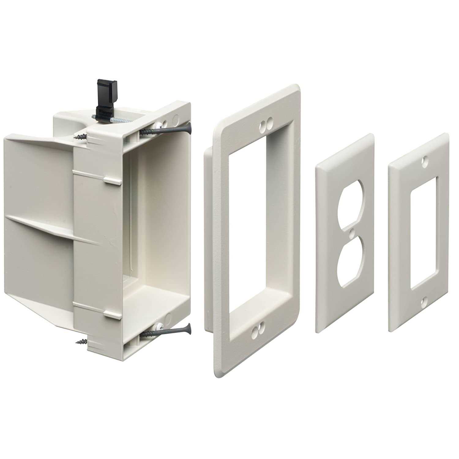 Color:White | Size:1 Gang Product Description Arlington DVFR1W-1 Recessed Electrical Outlet Mounting Box w/ Paintable Wall Plate, 1-Gang, WhiteRecessed box allows items, such as furniture, to be placed closer to the wallPlugs don’t extend past the wall like a regular boxTrim plate is textured / pain…