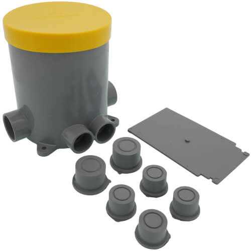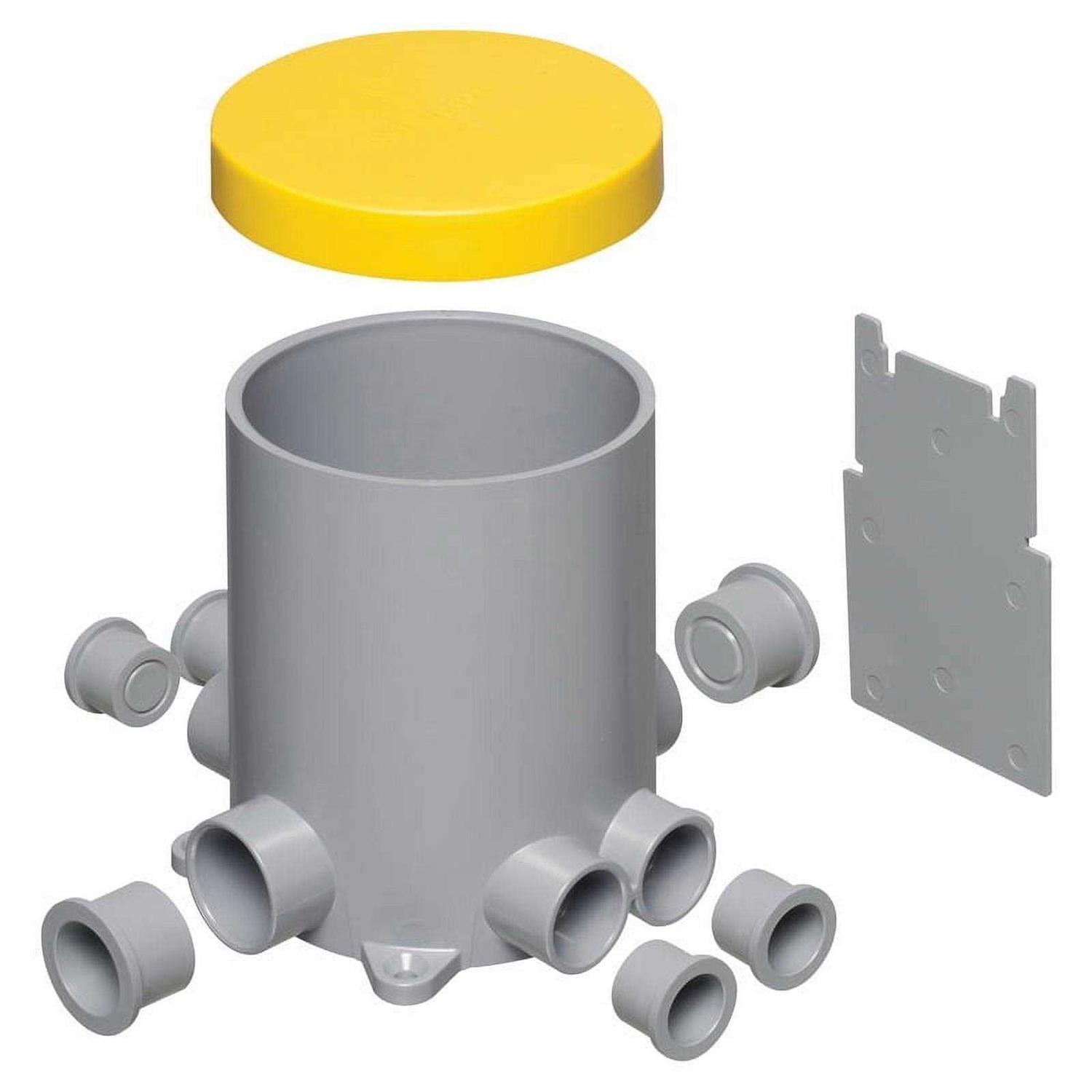 Made from plastic for durability Comes in gray color Has a depth of 5.95-inches Arlington Non-metallic 4.5-Inch round floor box with plugs, has plastic construction for durability. The floor box in gray color, is 5.95-Inch deep. Floor box is UL and cULus listed.