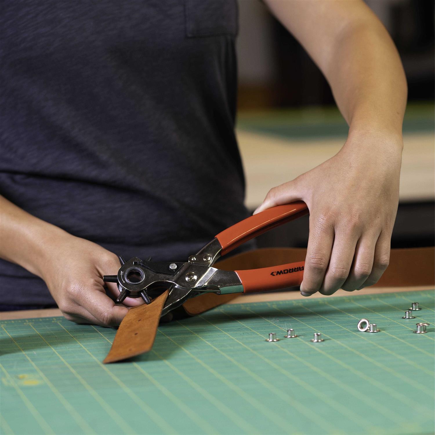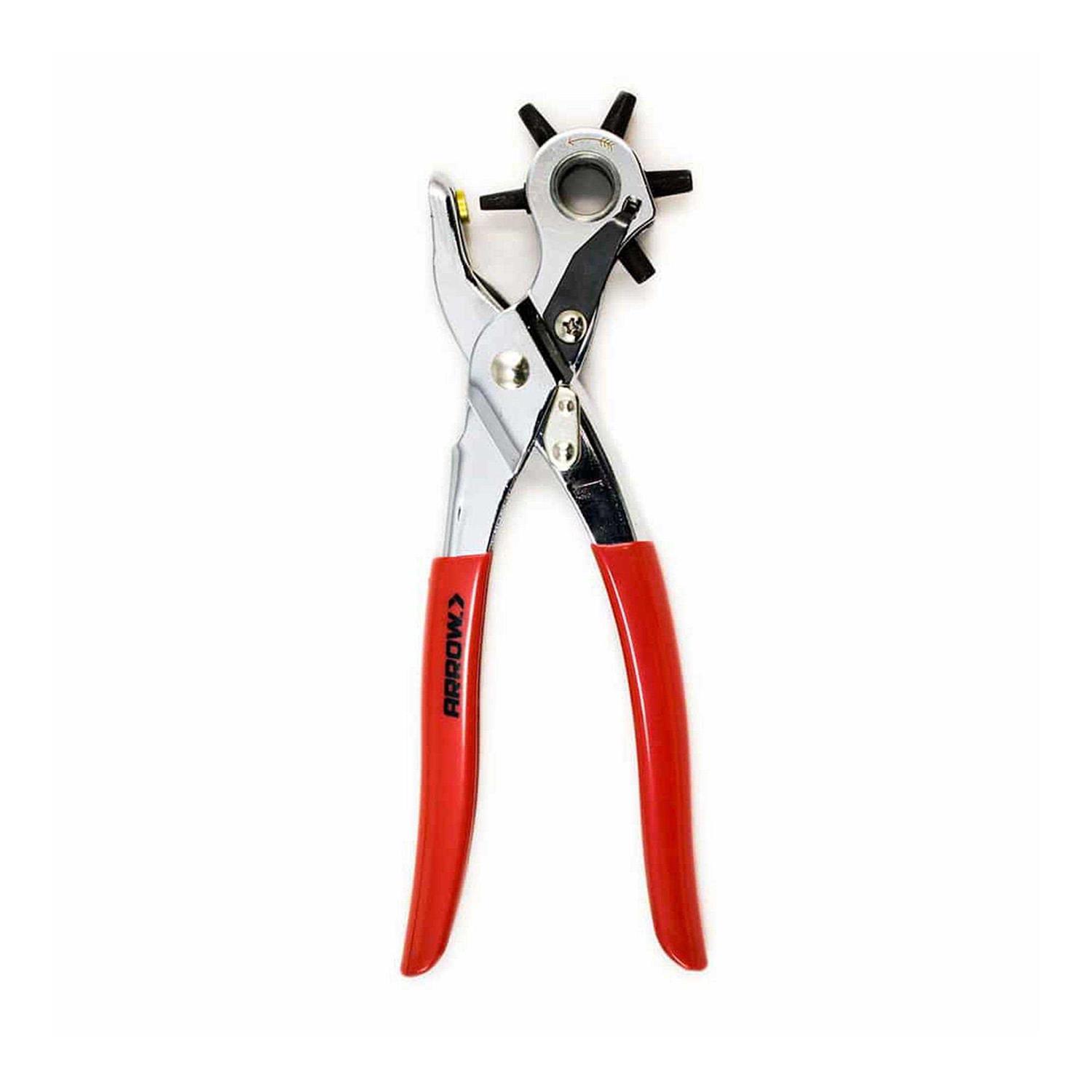 The Arrow Eyelet Pliers Kit includes 100-assorted gold, silver and bronze colored plated alloy steel eyelets and is a convenient tool for dyers to replace and add eyelets. It is ideal for leather, canvas, plastic, vinyl, cardboard and a variety of fabrics. The heavy-duty, spring tension pliers with quick action open and release are handy for setting small eyelets in belts, bags, clothing, crafting materials and more. They feature a non-slip rubber grip and easy-squeeze handle design for comfort, control and reduced hand fatigue. The eyelet pliers fasten 5/32 in. (4mm) diameter opening eyelets.
