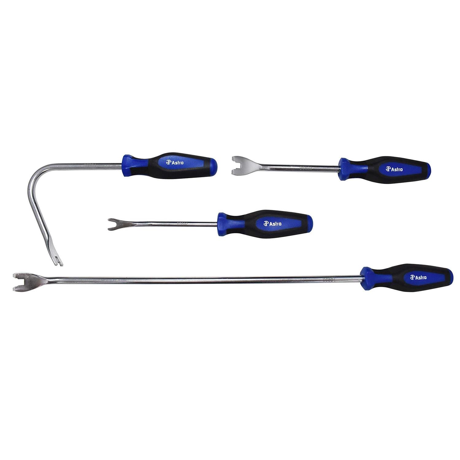 Features and Benefits: Ideal for tight spaces P.P. and TPR material handle provides comfortable and non-slip grip Full polish chrome plated shanks for long lasting corrosion resistance Astro Pneumatic 4 pc. Upholstery Tool Set (AST-9589) Each tool marked with the item number Complete set for removing door panel fasteners, upholstery and trim clips, dashboards and consoles and other plastic and metal clips of various sizes and shapes. Ideal for tight spaces. P.P. and TPR material handle provides comfortable and non-slip grip. Full polish chrome plated shanks for long lasting corrosion resistance. Made in Taiwan.”.