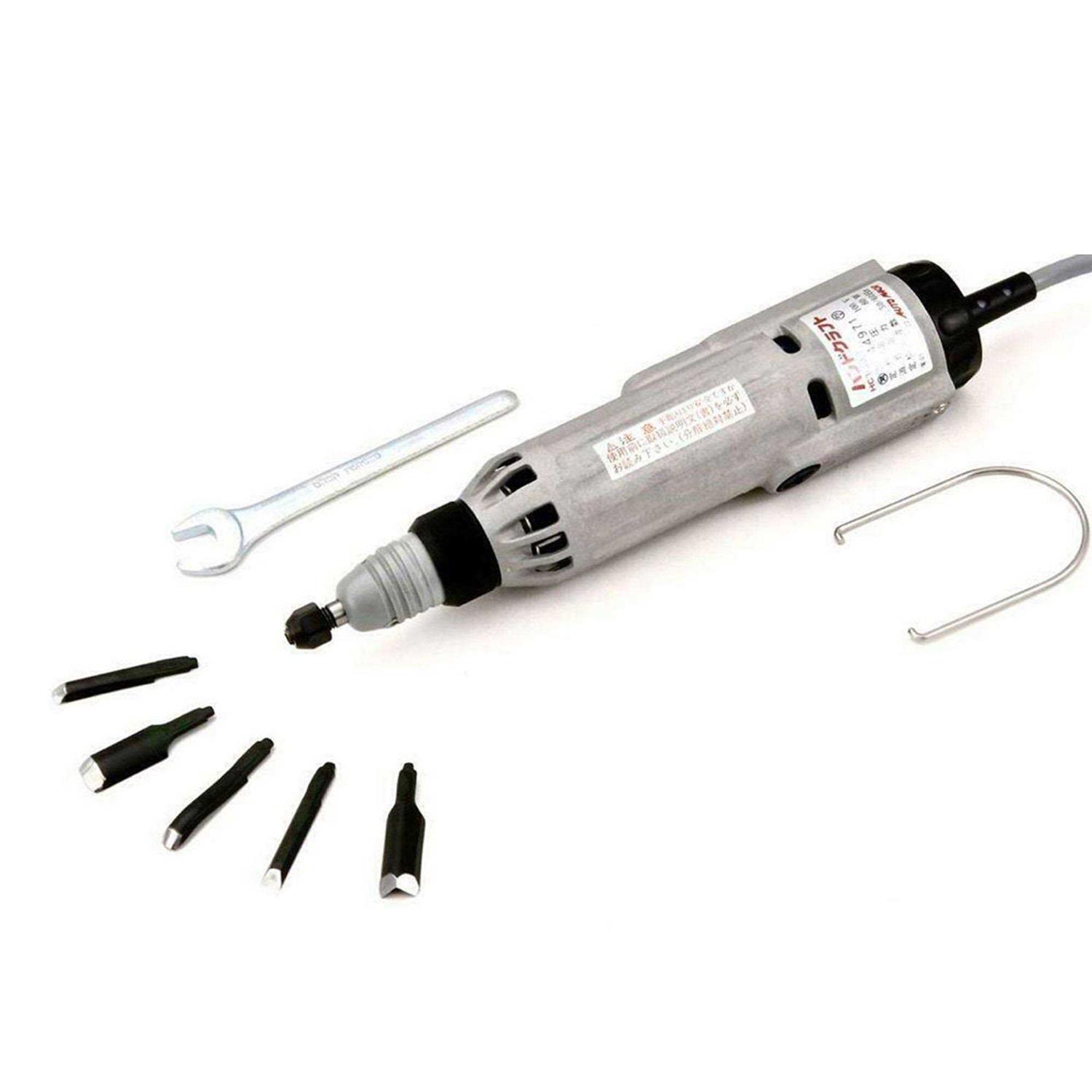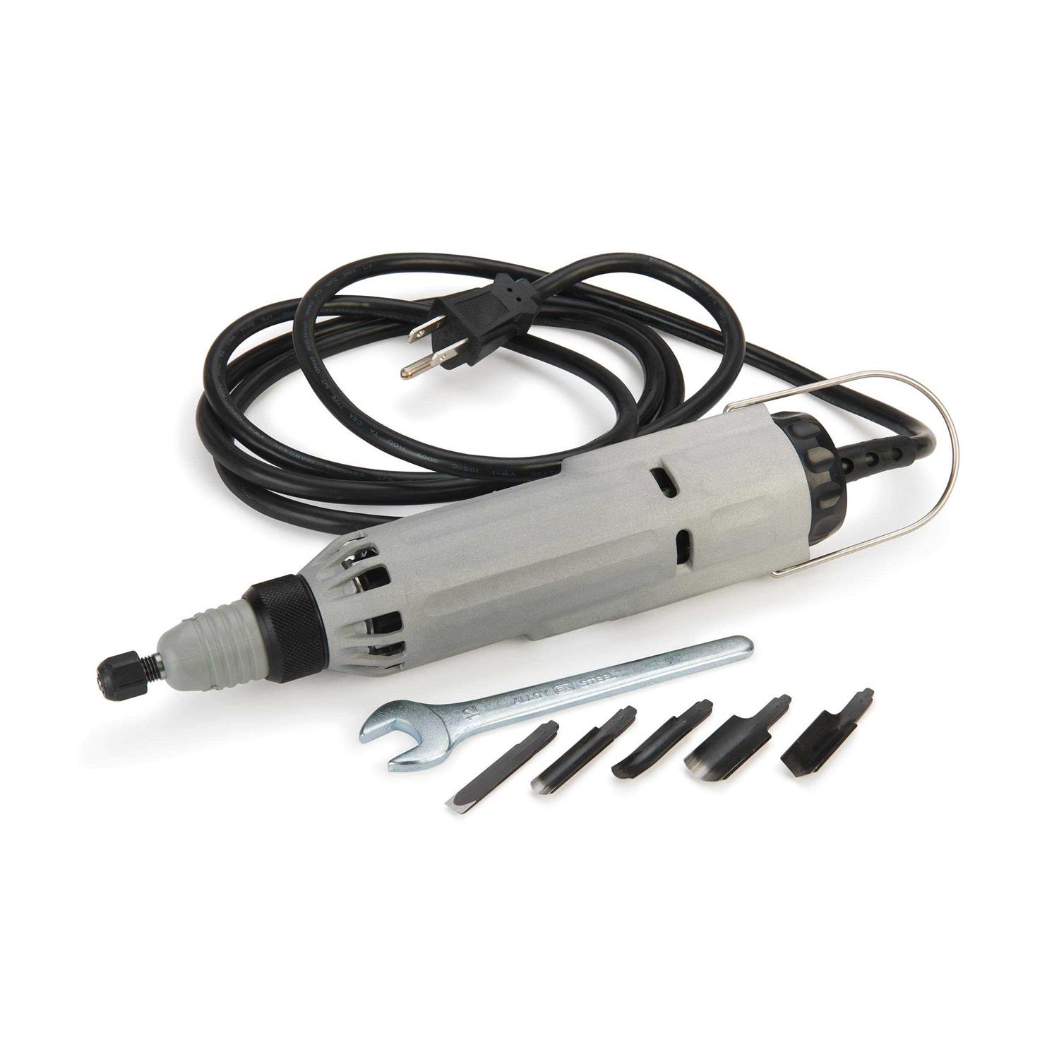 Model HCT 30A. The newest advancement in woodcarving technology! The Handcraft Carver is rugged and reliable. Aluminum die-cast body is light and vibration free. Special reciprocating action of the cutter head carves through the toughest woods with just simple hand direction. Greater pressure causes a deeper cut. For safety, free-floating action keeps blades motionless until pressed against wood. The laminated blades move at 10,000 vibrations per minute, leaving a smooth cut surface. Carvers appreciate the versatility in portability and movement, as well as accuracy and speed. A powerful 80-watt ball bearing motor delivers 10,000 vibrations per minute for 1mm cutting strokes. Includes 6′ grounded cord, rear on/off switch, hanger, five blades, two spanner wrenches, and complete instructions for use. Body measures 228mm (9 inch) long x 44mm (1-3/4 inch) diameter, 990 grams (2 lbs.) in weight. UL listed.