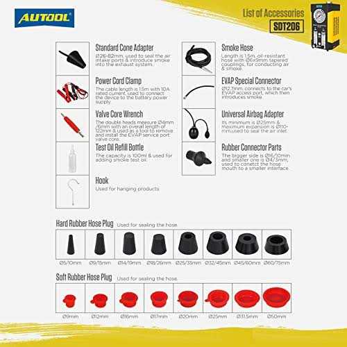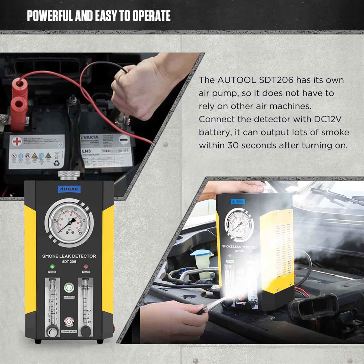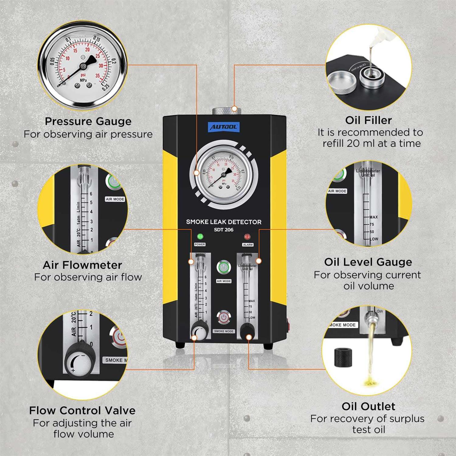 【Why Need It】Car Smoke Leak Detector is a professional auto pipe leak detect tool. The smoke can be produced within 7-15 seconds, dramatically reducing diagnostic time. Smoke output value: 1-6L/min. 【Flow Meter & Pressure Gauge】According to the pressure of the detection pipeline, it is controlled with a flowmeter to more effectively protect the pipeline from damage. By observing the pressure gauge, you can determine whether the pipeline is leaking more quickly and accurately. Usually the pressure gauge continues to rise, indicating that there is no problem with the pipeline. If the pressure gauge continues to decrease, Explain that the pipeline leak needs to be repaired. 【EVAP Detection】American cars that began production in 1996 are equipped with EVAP service ports; in most American cars, the EVAP service port is usually located in the engine compartment, but the EVAP service port of some special models may be located in other locations. Open the plastic cover of the EVAP service port, then use the spool wrench to remove the check valve clockwise, then install the EVAP service port adapter, and introduce smoke from the port into the EVAP leak detection system. 【Wide Testing Range】Built-in air pump,The smoke leak detector can do smoke testing of multiple systems, such as EVAP systems, Intake Systems, Cooling / EGR /Exhaust Systems, Crankcase Systems, Engine Airtightness, Vacuum Leaks, Low Pressure Turbo leaks.Applicable cars, motorcycles, snowmobiles, off-road vehicles, ATVs, light trucks and speedboats boats. How to operate? 1. Open the engine cover, and hang the detector in the cover. 2. Disconnect the pipe that needs to be connected with detector. If the pipe needs to be disconnected in the middle. Please secure the other side with a rubber stopple. 3. Secure this side with proper taper stopple/pipe, and connect it with smoke output tube. 4. Connect detector with DC12V battery: red with positive, black with negative. Do not connect in a contrary way. 5. Turn on the power switch, and detector starts to work. 6. Adjust the flow gauge. Control the input smoke value and pressure to make sure the pipe system can afford the pressure. 7. In about 3 minutes, the pipe will be filled with smoke. 8. Observe the floating ball in flow gauge. If the floating ball stays still in the bottom, the pipe is sealed with. If the floating ball is arising or bouncing, the pipe is leaking. 9. Position the leak points by floating ball. If the bounce arises highly, the leakage is serious. 10. Check the leak points. Please use head lamp if necessary. 11. After leak detection, please connect well the wires and pipe. Packing List: 1pc * AUTOOL SDT 206 Car Smoke Leak Detector Main Unit 1pc * Hook (with hand-tighten nuts) 1pc * Rubber Connect Parts 1sets * Hard Rubber Hose Plug (with serial specification) 1sets * Soft Rubber Hose Plug (with serial specification) 1pc * Standard Cone Adapter 1pc * Universal Airbag Adapter 1pc * Power Cord Clamp 1pc * Valve Core Wrench 1pc * Test Oil Refill Bottle(oil not included) 1pc * EVAP Special Connector 1pc * Smoke Hose 1pc * User Manual