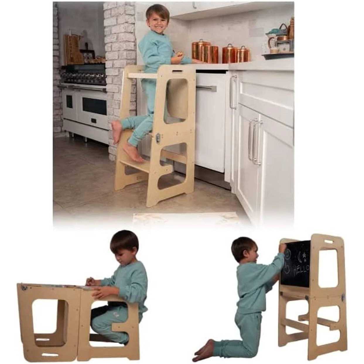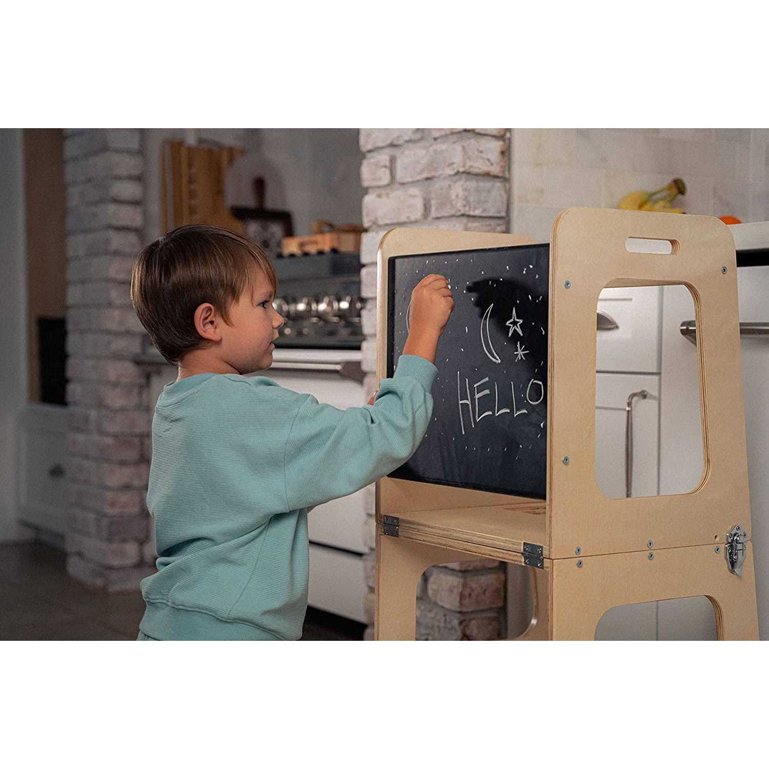 Meet The Date, the ultimate step stool that’s redefining functionality and creativity in every little nook of your home! Crafted with love and innovation, this patented design isn’t just a step stool; it’s a chameleon of the furniture world, ready to adapt to your and your child’s ever-changing needs. Imagine a world where your little helper gains independence, self-confidence, and a plethora of skills, all from a piece of furniture—that’s the Date for you. Kitchen tower Desk Step Stool Chalkboard This magical helper transforms seamlessly from a step stool, bringing your child to the perfect height to join in on kitchen activities or to reach the bathroom sink for toothbrush time. With a simple flip, it becomes a table for all things fun and educational—coloring, crafting, or even serving as a desk for eager young minds. And for the cherry on top, it boasts a blackboard surface, inviting endless creativity or a unique learning experience. The Date is not only a wonder for kids but also a dream for parents. Made from premium ¾ inch birch plywood, it meets all US safety regulations, ensuring it’s as safe as it is strong. With side handles, a back-guard rail, and no need for professional installation, it’s designed to keep your little ones secure. Welcome to the world of the Date, where fun meets function in the most delightful way!