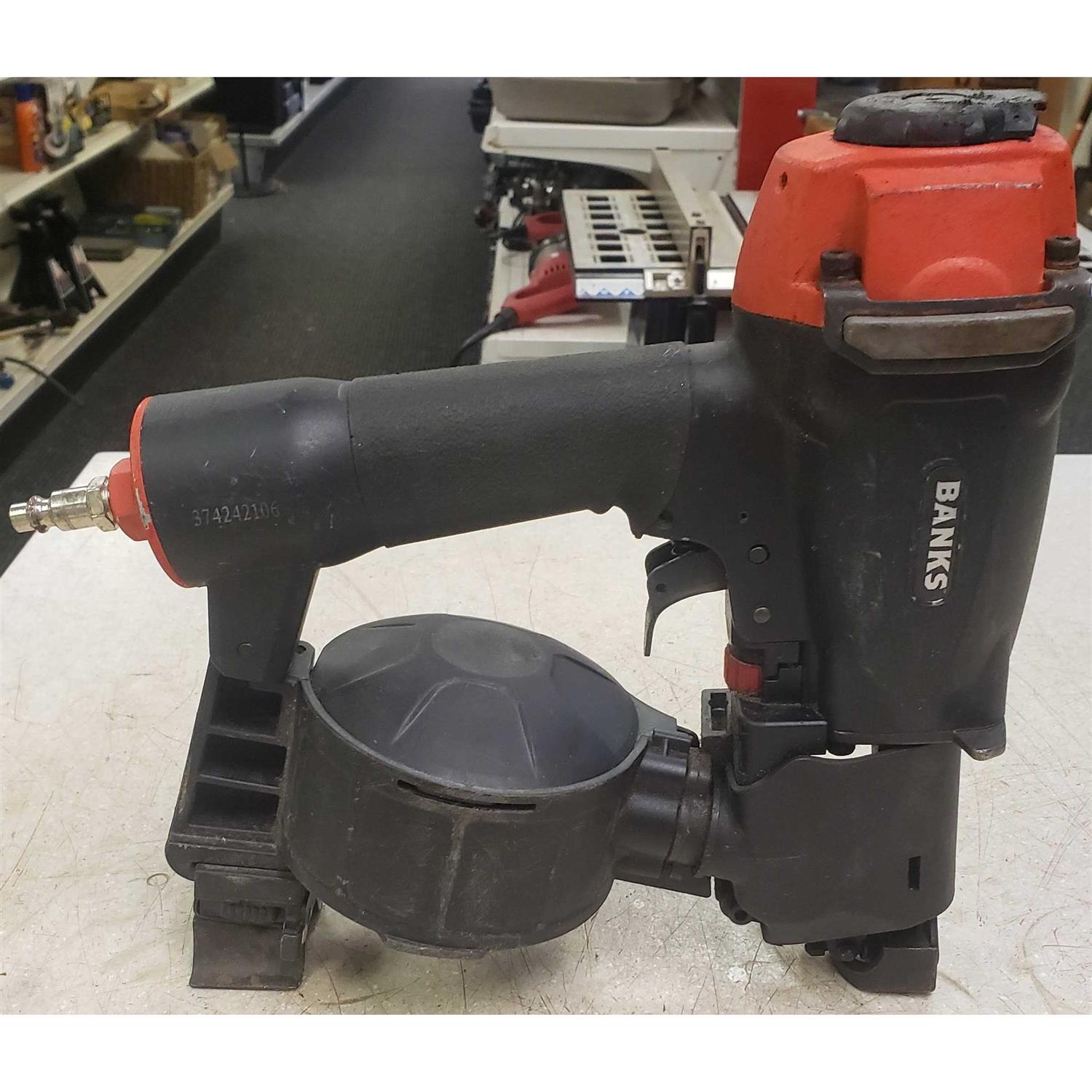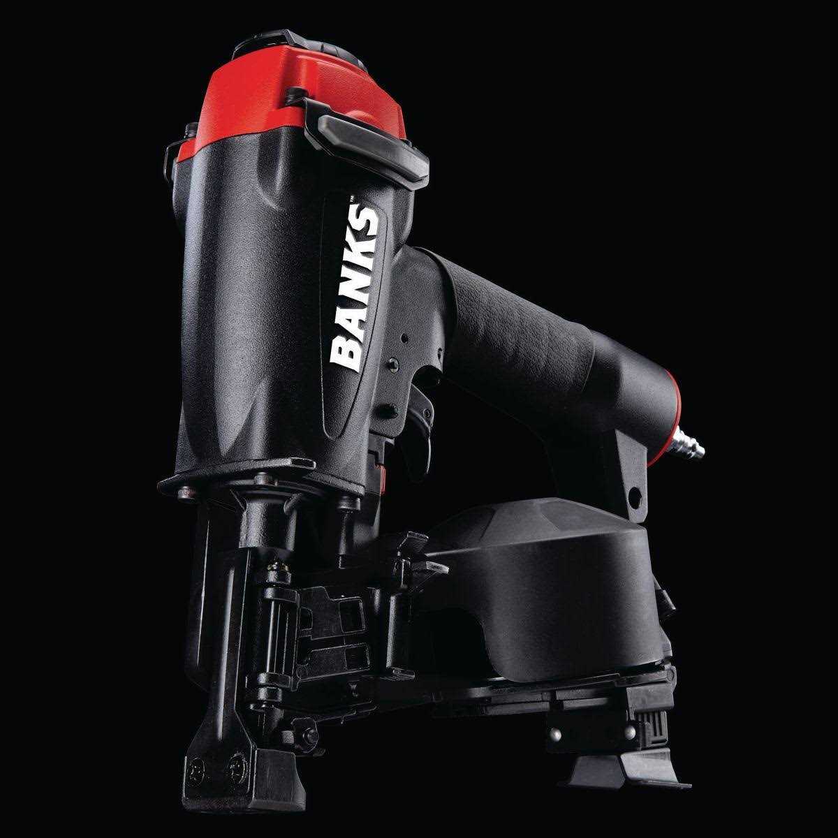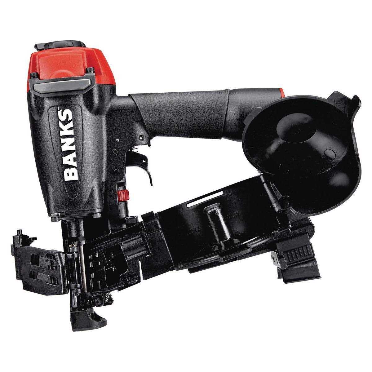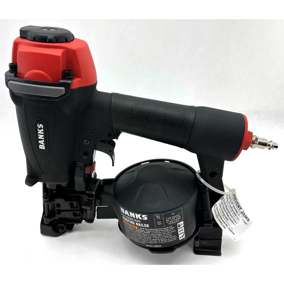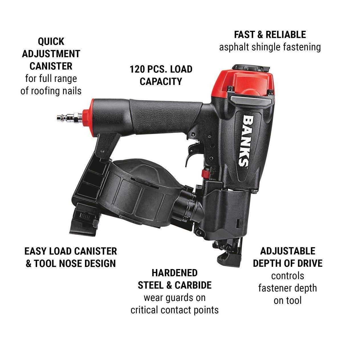 The Banks Roofing Nailer is designed to handle all types of asphalt shingles and tar paper. This rugged nailer shoots full round head nails from 3/4 in. – 1-3/4 in. long. The firing mechanism can be switched easily from sequential to contact trip. Designed for fast, reliable asphalt shingle fastening Adjustable depth of drive controls fastener depth on tool Easy load canister and tool nose design