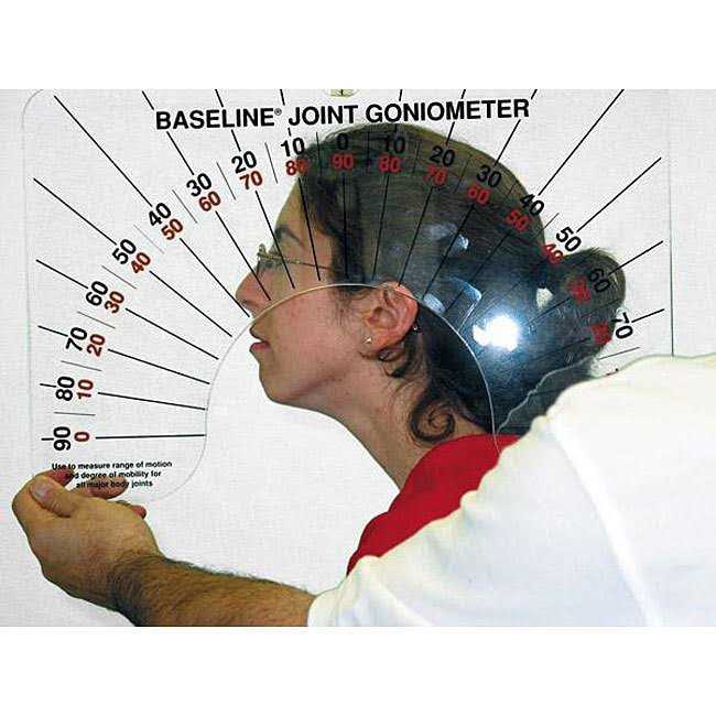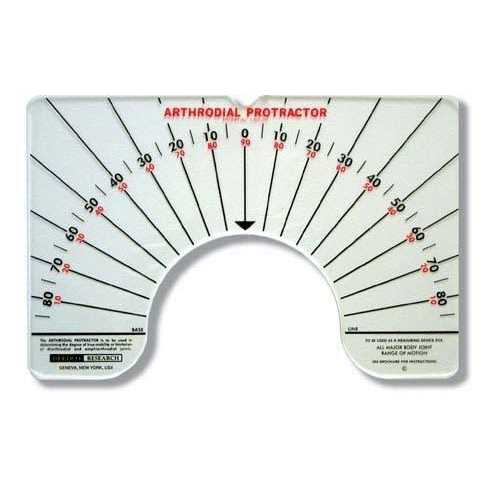 It measures range-of-motion for all major articulations, cervical rotation, lateral flexion of the head and anterior-posterior cervical flexion. Bubble level assures measurement is made on horizontal plane. Two 180 degree opposing scales in 5 degree increments.