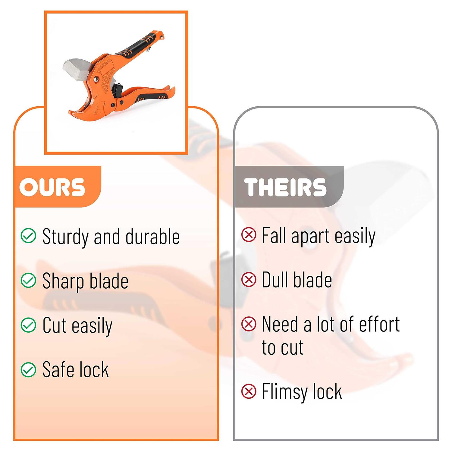 Bates ratchet-type pipe cutter is made of manganese steel with high hardness, good toughness, strength, and durability. It also features a ratchet mechanism that makes cutting through pipes quick and easy – perfect for anyone who wants to get the job done fast.. The rubber-textured handle is comfortable to use, reliable to hold, and not easy to hurt. A stainless steel buckle is at the bottom of the tube cutter for easy storage. When you don’t use it, you can shrink the handles on both sides and lock the security lock to save space and prevent accidental injury.. Bates ratchet-type pipe cutter is perfect for easily cutting through pipes. The triangle design at the edge of the knife allows better access to the pipe, while the unique structure design makes it easy to cut pipes with a few presses.. Our tube Cutter is ideal for use on various plastic pipes and tubes. It is an essential cutting tool for handymen, plumbers, electricians, and vehicle mechanics. The cutter is commonly used for cutting most kinds of plastic (PVC, CPVC, PP, PEX, PE, rubber hose) and multilayer tubing..,,Bates Choice Pro