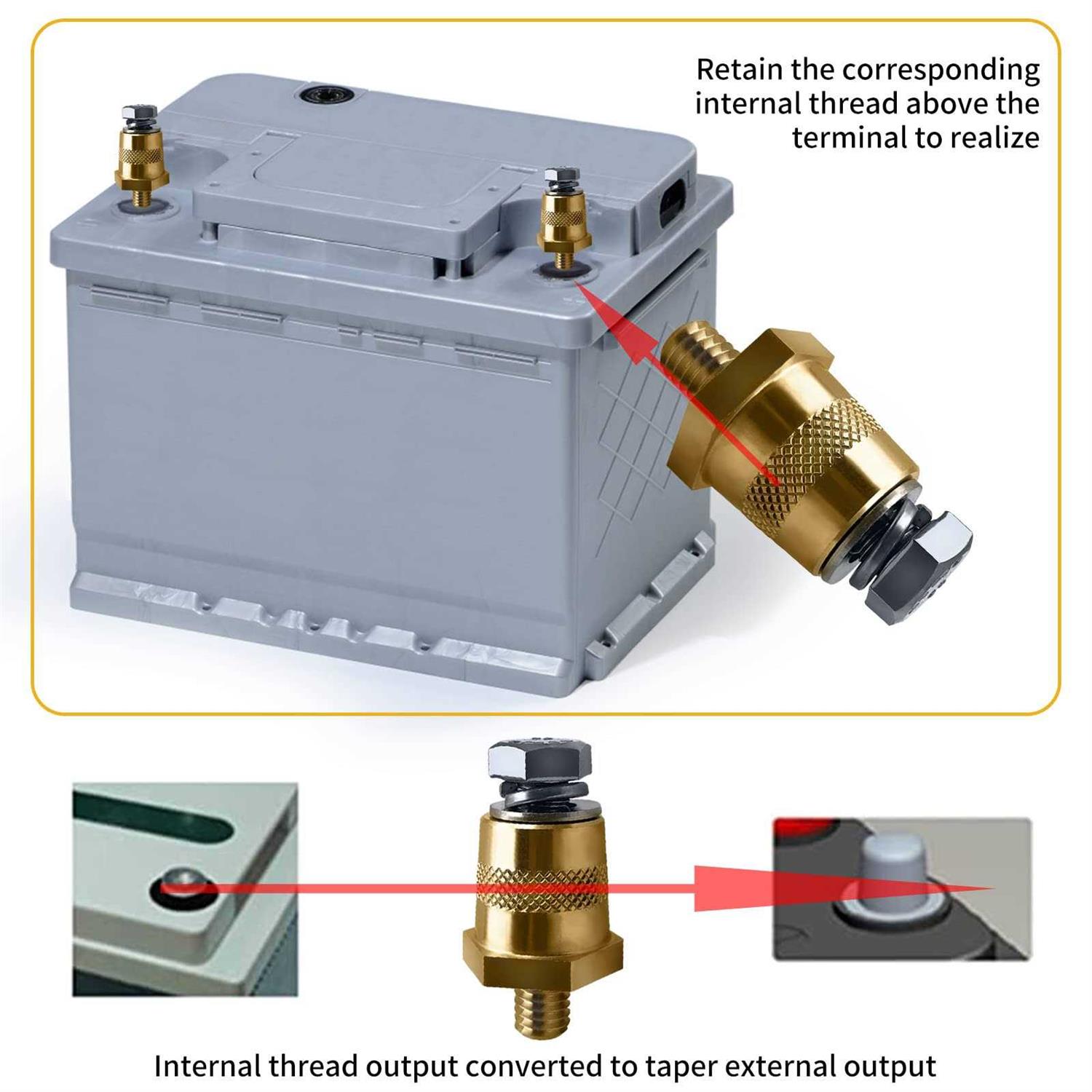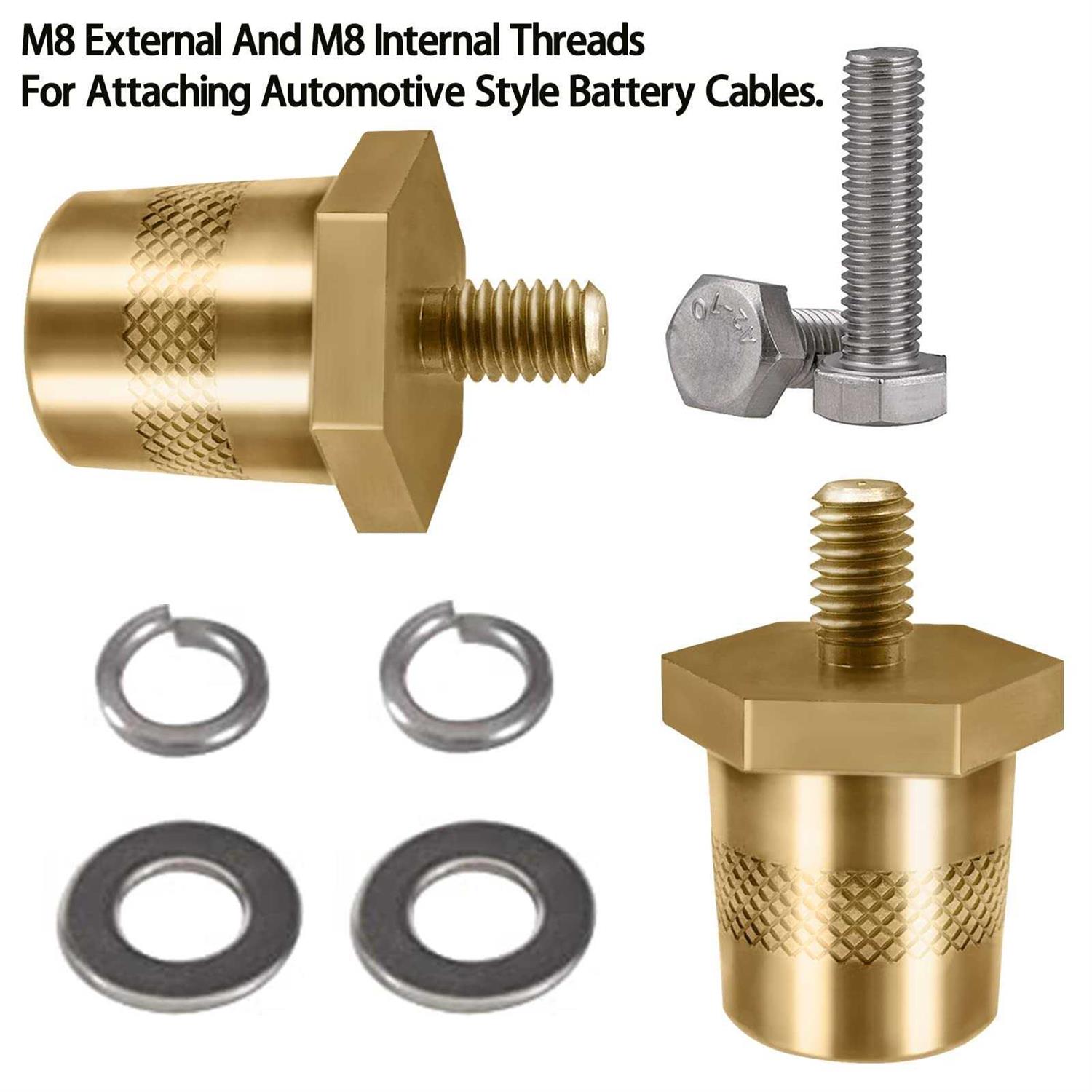 Stud thread M8Easy to use–Easy and reliable direct connections to the battery. – Fitment–Excellent for trailer brake controls and other accessories requiring direct power,maintenance free connection. – Solid brass bolt extender and plated steel nut are used for power hook-up for direct connections of accessories to battery – Package include: 1X Brass Negative Extender Bolt Terminal1X Brass Positive Extender Bolt Terminal2X Stainless steel Studs4X Stainless steel Gaskets – Warmly Note: The colors may have