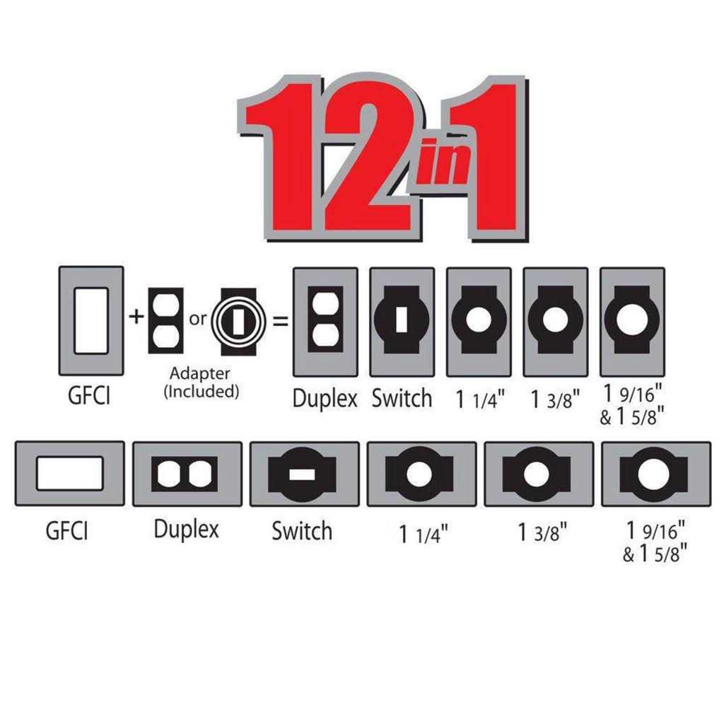 - Single gang; GFCI plus adapter plates provide 12 in 1 possible configuration types.