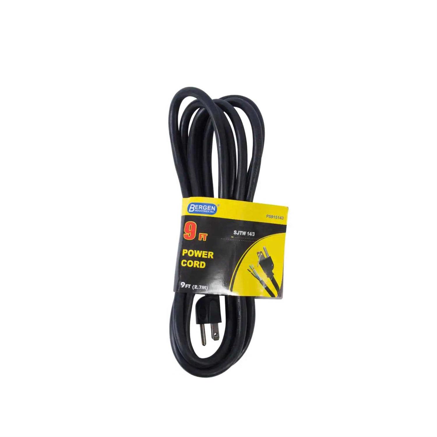 Bergen Industries Inc.s 9 Foot 3-Wire black replacement power cords are ideal for appliances, motors and power tools. Weve solved your power problems by allowing you to easily replace old cords as they become frayed, damaged, and unusable. Our cords are constructed with heavy-duty 14/3 AWG cable and are molded 15 Amp, allowing them to fit most of your power cord replacement needs.