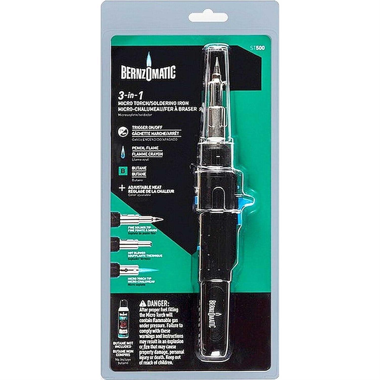 Complete a variety of repair or hobby projects using the Bernzomatic ST500T Auto Ignite Butane Torch. It features a fine, precise tip to ensure accuracy even on small objects. There are also three settings on the Bernzomatic torch. Choose solder for pipes and other metals, the hot air blower to dry glue or epoxy and the micro torch for precision tasks such as heat-shrinking wire or jewelry repair. Flame adjustment allows for even greater precision while the continuous flame lock keeps it lit while in use. The electric ignition makes it easy to turn on yet is child-resistant and has an auto-stop function to provide safety. A cordless design allows freedom of movement while you work. Additional fuel canisters for this refillable butane torch are also available (sold separately).