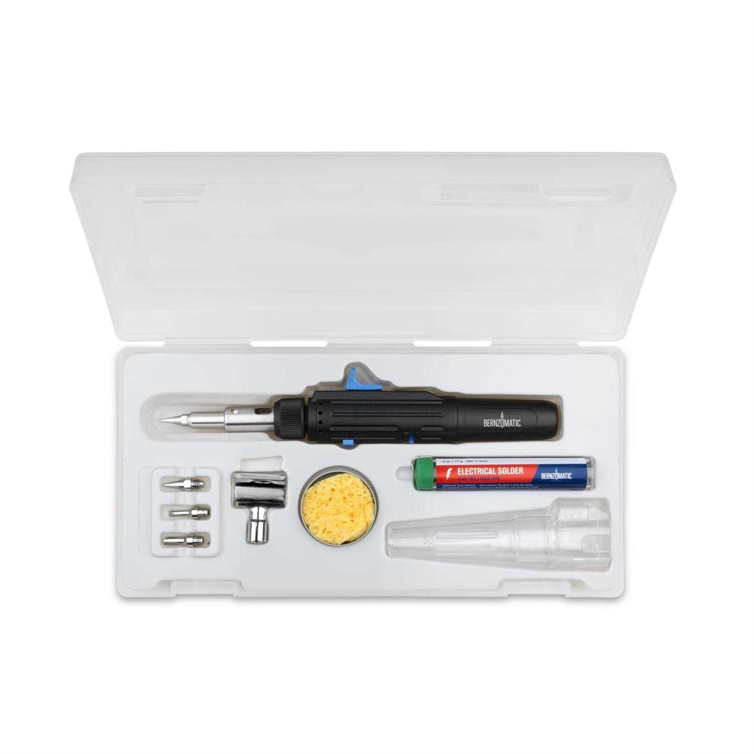 Designed for precision work including fine soldering, jewelry repairs, craft projects and heat shrinking wire, the Cordless Soldering Iron for Hobby and Household Use features seven interchangeable settings: micro torch, hot air blower, fine solder, large solder, round, chisel point and heat shrink. A flame adjustment fine-tunes the precision flame, the electric ignition makes lighting easy and a continuous flame lock keeps the torch lit while in use. Auto start/stop ignition easily ignites and extinguishes flame. Adjustable flame control easily sizes flame for different applications. Continuous flame lock keeps torch lit. Pinpoint flame for detailed work. CPSC approved child resistant ignition. For use with butane fuel such as the Bernzomatic 5.5 oz. Butane Cylinder. Kit includes a micro torch with seven interchangeable settings, a cleaning sponge, 0.6 oz. of electrical solder and a storage case.