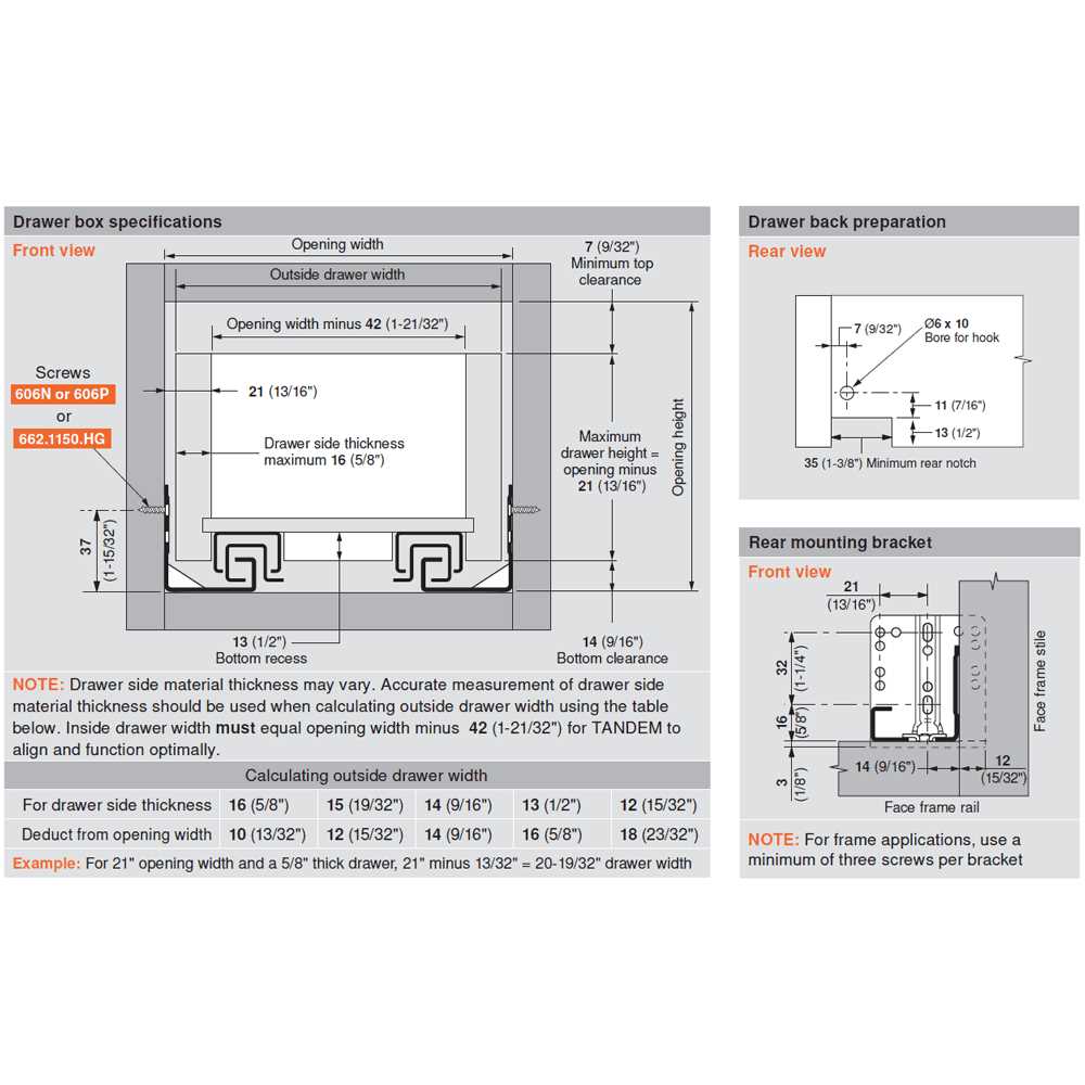 Blums newest generation of TANDEM plus BLUMOTION concealed drawer runners offers four-dimensional adjustment, elongated holes for depth adjustment, bottom mount holes and exceptional load capacity (100 lb. static load). TANDEM plus BLUMOTION concealed runners are made in the USA at Blums North Carolina facility. This is just one example of Blums commitment to manufacturing in the US, for the US. TANDEM plus BLUMOTION is mounted discreetly beneath the drawer and has the quietest opening and closing action available. This top-of-the-line concealed runner is the industry choice for dovetail drawers in high-end cabinetry, in either face frame or panel. For installation on both face frame or frameless cabinet drawers Fully concealed drawer slides are full extension Designed for drawers that are 1/2″ to 5/8″ thick. Requires notch and hole drilled on back underside of drawer box. Everything you need!
