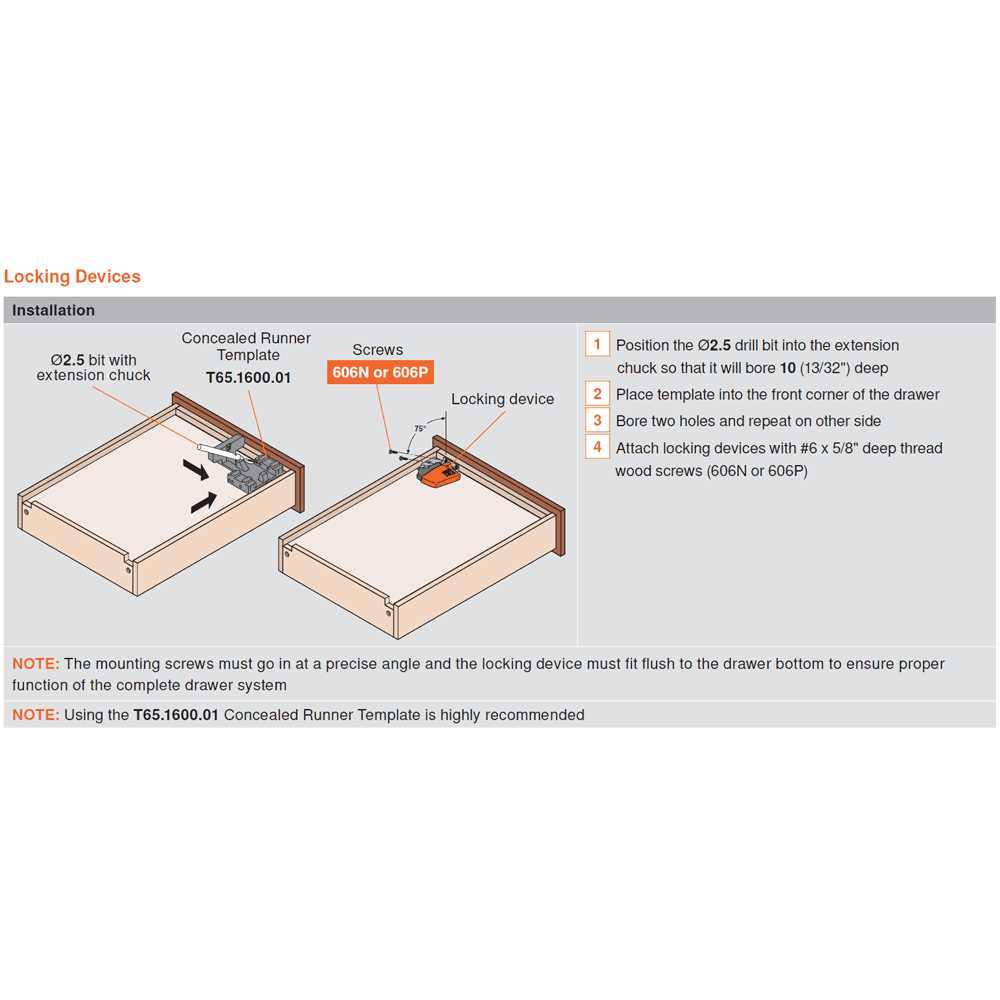 Mounting Type: Screw on. Notes: One right & one left required per drawer. Minimum interior drawer width 4-3/4 inch. Height adjustable +1/8 inch. Product Type: Locking Device: Standard. Sold: Each.