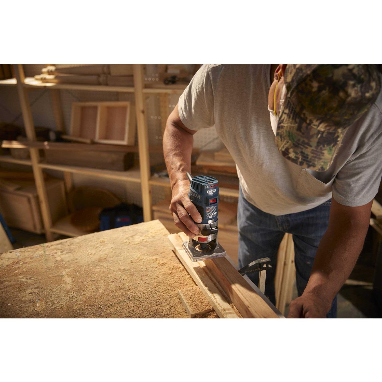 The Bosch PR20EVS Colt electronic variable-speed palm router combines power, precision and versatility in a small-sized tool. It has a 1.0 HP, 5.6 Amp motor that spins at a variable speed of 16,000 to 35,000 RPM. The variable speed dial is conveniently mounted on top of the tool body. The router features Constant Response circuitry, which maintains a consistent speed by detecting heavy loads and increasing power to maintain the selected RPM. It features soft-start circuitry, which reduces startup torque. Additionally, depth adjustment is simple; just align and lower the motor and then lock the router in position with the clamping level. Micro-fine adjustments are equally effortless, thanks to the wheel on the back of the router’s base. It accepts standard 1/4 In. bits for flexibility, with an impressive max cutter diameter of 1-5/16 In. The motor housing has a palm-shaped, rubber over-molded grip that allows for comfortable operation. And the included rugged aluminum fixed base is durable, solid and precise.