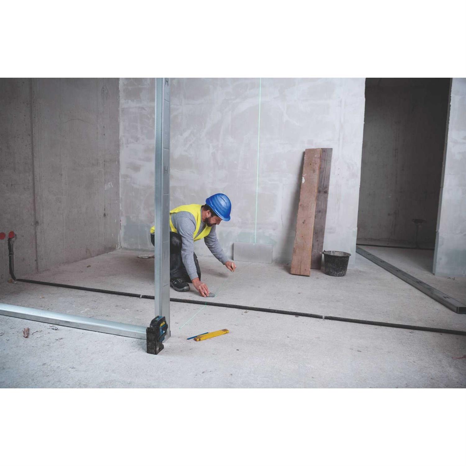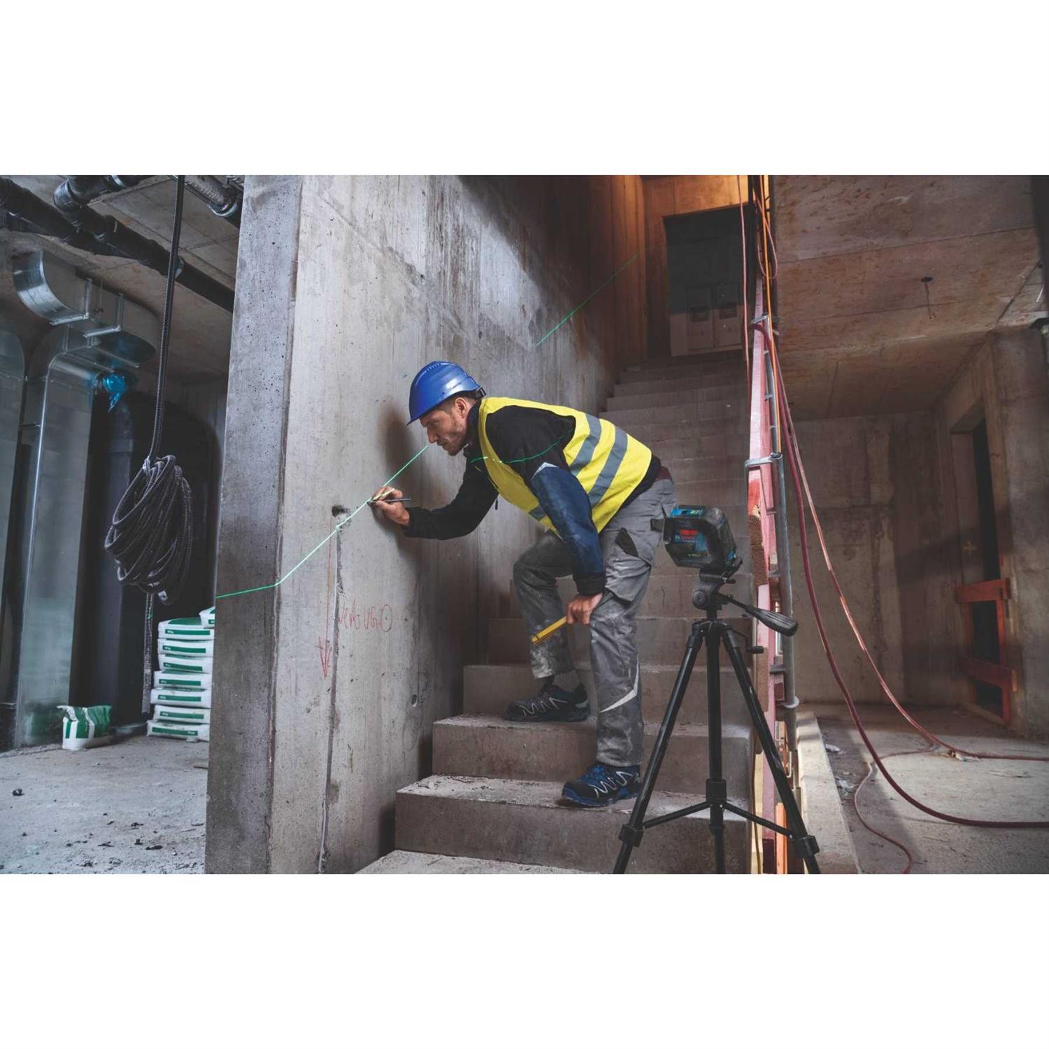 The Bosch GCL100-40G green beam self-leveling cross line laser with plumb points uses green-beam technology, which emits green lines and points up to 4X brighter than standard red beams. This gives the laser a working range for the lines of up to 165 ft. The laser produces vertical, horizontal, cross line modes, as well as upward and downward green plumb points. The tool can project two lines independently or together, for a broad array of alignment and leveling applications. It includes Bosch exclusive VisiMax technology, which monitors tool temperature and power consumption to deliver the brightest line for the job. The tool has full rubber overmold housing, designed to be similar to a roll cage, so every major impact point is reinforced with rubber. It is an IP64 rating and features deeply recessed windows help protect the laser glass. The onboard user interface allows easy selection among the layout modes. The Bosch smart pendulum system self-levels and indicates out-of-level condition and it locks the pendulum for secure transport. The included RM10 rotating mount offers quick setup, extra strong magnets and fine adjustment rotating nob.
